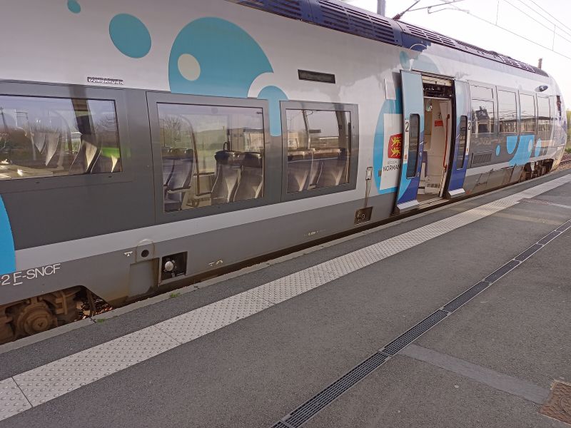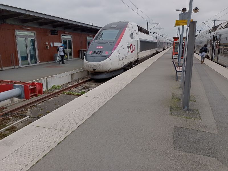 Um 7:59 beginnt unsere Fahrt von Granville zunächst nach Dol de Bretagne. Nachdem das AGC aus Richtung Caen im Bahnhof angekommen war, leerte es sich fast vollständig. Zur Weiterfahrt Richtung Rennes befindet sich bei Abfahrt gerade einmal eine einstellige Zahl an Fahrgästen im Zug. In Anbetracht des dünnen Fahrplans ist diese geringe Nachfrage erwartbar. Auf der Gesamtstrecke von Caen nach Rennes bietet die SNCF neben dem spärlichen Bahnverkehr auch Schnellbusse über die Autobahn an, die deutlich kürzere Reisezeiten zwischen den beiden Städten ermöglichen.