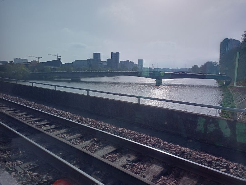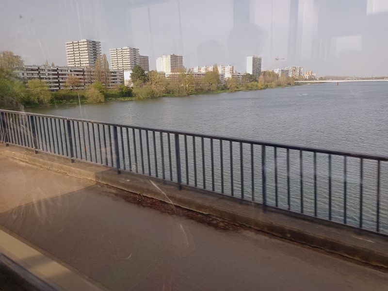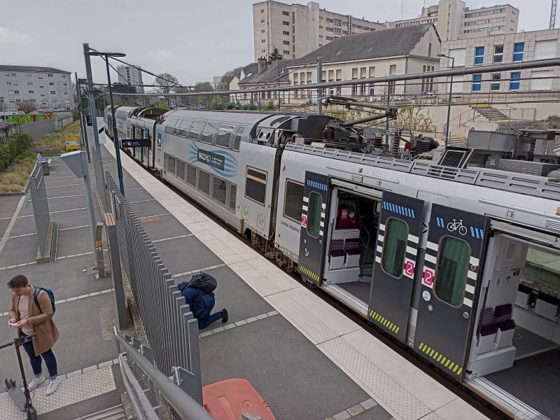 Nach der zügigen Fahrt erreichen wir Nantes um kurz nach 17:00. Dort unternehmen wir noch eine kleine Stadtrundfahrt. An Bord einer AGC-Doppeltraktion in Richtung Sainte-Pazanne queren wir die Île des Nantes, eine früher industriell geprägte Stadtinsel, die mittlerweile einen deutlichen Strukturwandel durchgemacht hat. Vom ersten Halt Rezé Pont-Rousseau aus fahren wir mit der Straßenbahn zurück in die Innenstadt.