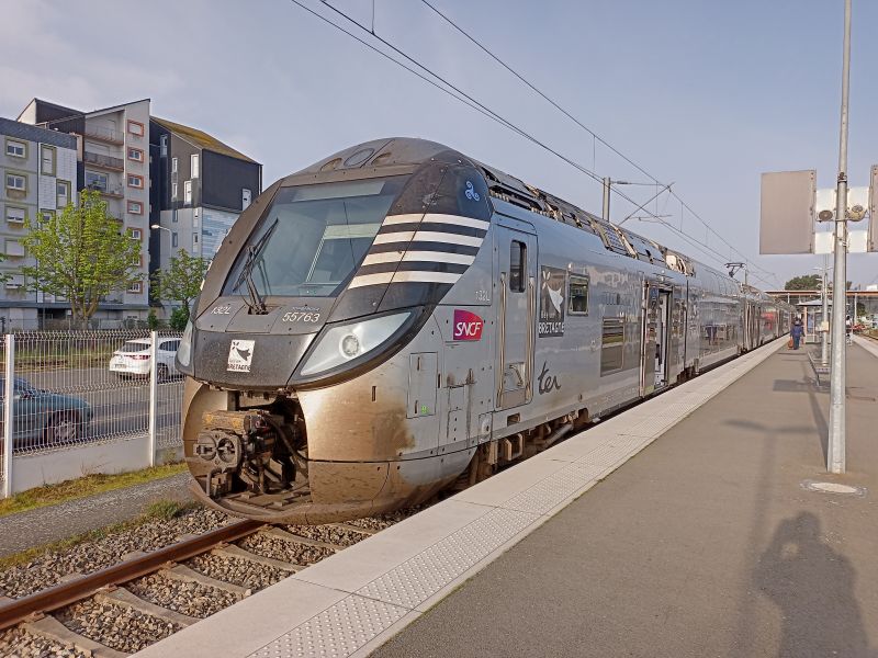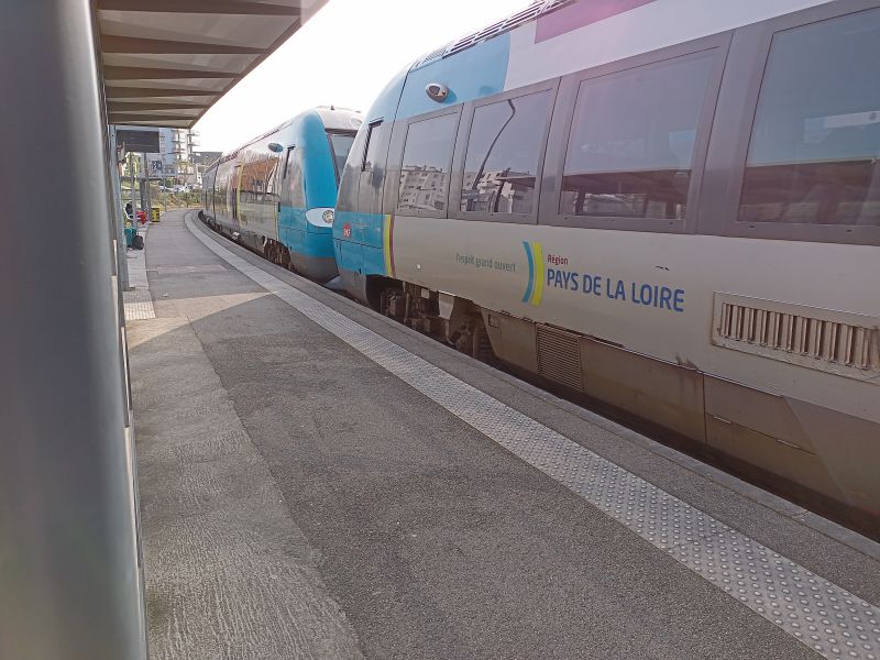 Nach der Mittagspause und der anschließenden Weiterfahrt mit der Metro zum Bahnhof setzen wir die Reise fort. Betrachtet man die folgende Zugfahrt auf einer Karte, könnte man kaum glauben, dass es sich dabei um einen Direktzug und zu dieser Zeit auch um die schnellste Verbindung zwischen den beiden Städten Rennes und Nantes handelt: Unser Zug fährt von Rennes zunächst in östlicher Richtung bis kurz vor Le Mans, biegt dann nach Süden ab bis Angers und nähert sich schließlich Nantes aus westlicher Richtung durch das Tal der Loire. Das entspricht 260 Strecken-Kilometern für eine Luftlinie von 100 Kilometern. Es gibt zwar auch direkte Züge über eine kürzere Strecke. Diese fahren allerdings im Schnitt deutlich langsamer, denn unser Zug schafft die 260 Kilometer in rund 2,25 Stunden (115 km/h im Mittel trotz 10 Minuten Standzeit in Sablé-sur-Sarthe). Die hohe Durchschnittsgeschwindigkeit liegt einerseits am Fahrzeug. Der Zug wird mit einem Z-TER gefahren. Dieser Nahverkehrstreibwagen erreicht in der Spitze 200 km/h und kann das auf weiten Teilen der Strecke auch ausfahren. Zum anderen liegt die hohe Geschwindigkeit an der Infrastruktur, denn zwischen Laval und Sablé-sur-Sarthe befährt der Zug die LGV Paris – Bretagne (LGV = Ligne à grande vitesse). Es handelt bei den Zügen auf dieser Linie (von den TERGV abgesehen) um die einzigen Regionalzüge in Frankreich, die eine Hochgeschwindigkeitstrecke mit benutzen.