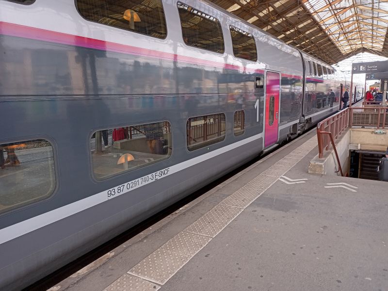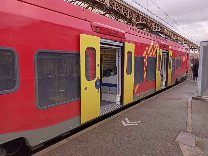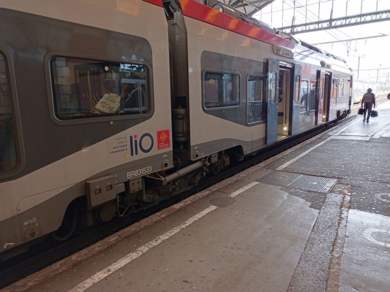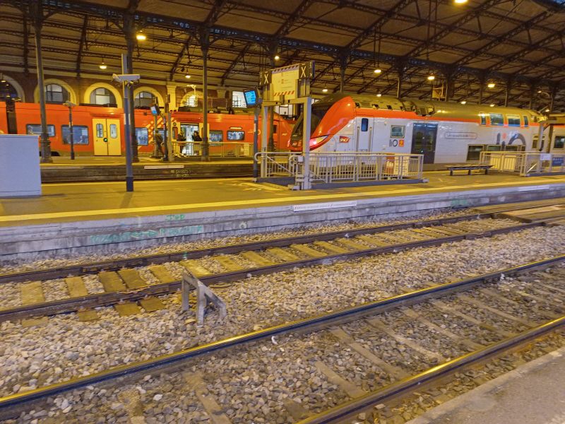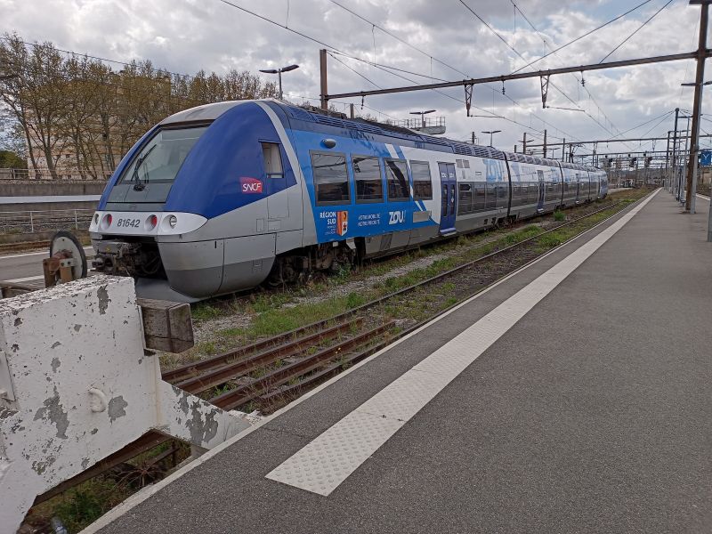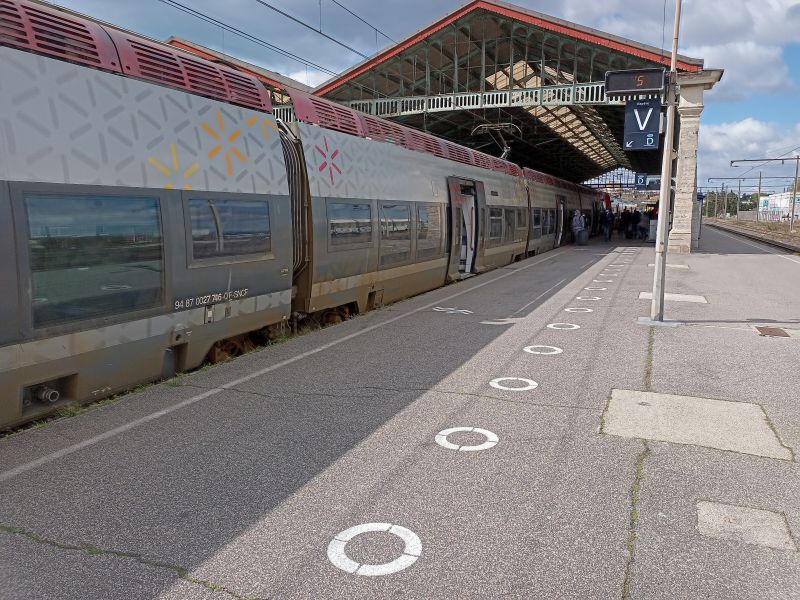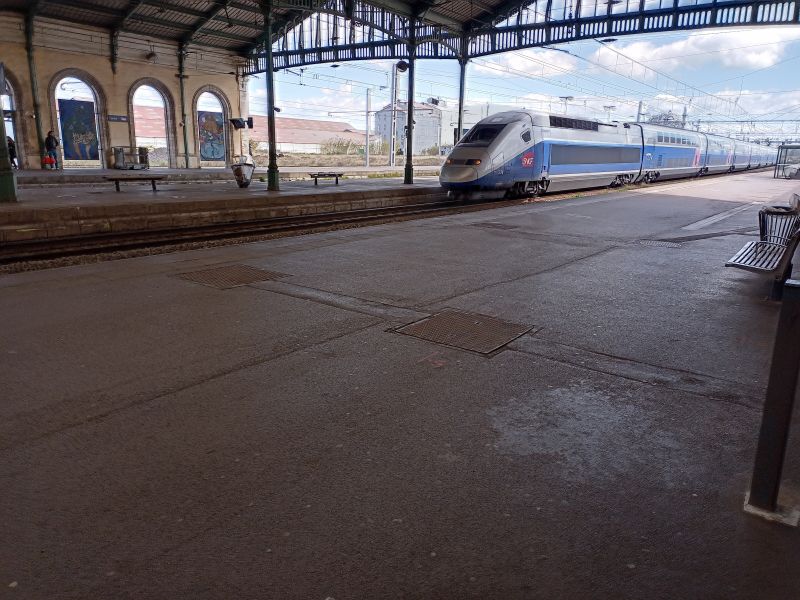 Als wir das Hotel am Morgen verlassen, ist vom rauen Wind der Nacht auf der Straße kaum etwas zu spüren. Wir begeben uns zum Bahnhof, an dem unser erster Zug des heutigen Reisetages mit einer kleinen Verspätung angekündigt wird. Der Régiolis kommt mit einer großen Menge an Fahrgästen ca. 5 Minuten nach der planmäßigen Abfahrtszeit aus Richtung Nordwesten in den Bahnhof eingefahren, leert sich, füllt sich wieder und fährt weiter, nachdem noch ein Güterzug vorgelassen wurde.