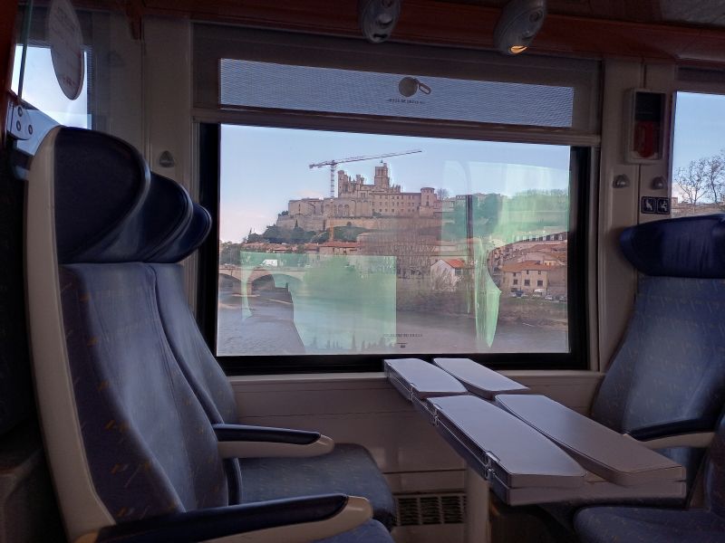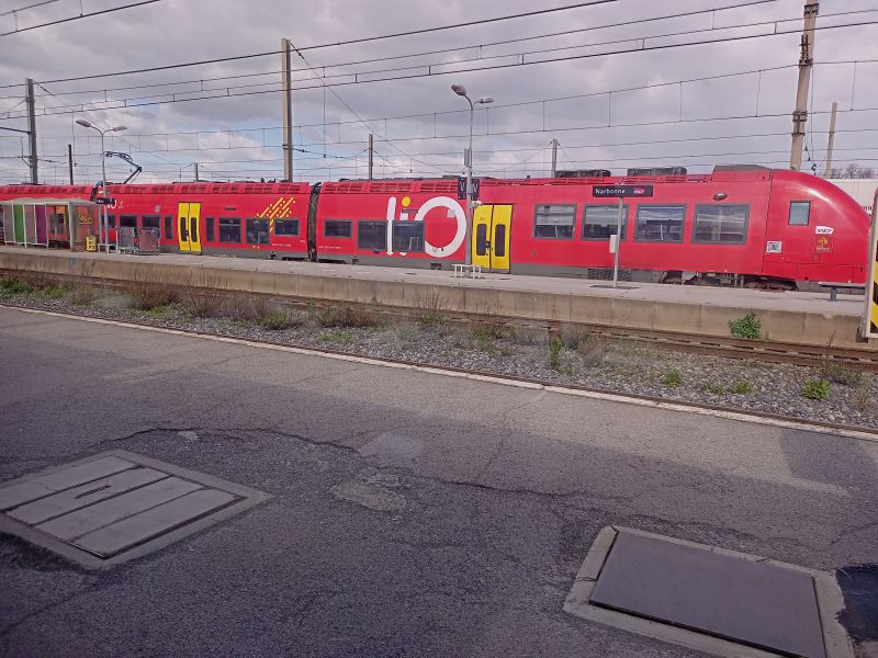 Pünktlich kommt ein Régiolis in Richtung Perpignan angefahren. Der Zug fährt bis Narbonne auf der Hauptstrecke Bordeaux – Marseille und hat dort einen längeren Aufenthalt zum Fahrtrichtungswechsel, bevor er in Richtung der spanischen Grenze von der Hauptstrecke abzweigt. Wir steigen in Narbonne um in einen Zug, der die Fahrt auf der Hauptstrecke in Richtung Avignon fortsetzt. Der Knotenanschluss um 11:00 in Narbonne wird durch zwei entsprechende Gegenzüge Perpignan – Narbonne – Toulouse und Avignon – Narbonne zu einem vollwertigen Rendez-Vous-Knoten komplettiert, der auch von vielen Fahrgästen zum Umstieg genutzt wird. Als Anschlusszug wartet eine AGC-Doppeltraktion. Wir könnten mit diesem Zug nun bis Avignon durchfahren, allerdings möchten wir unterwegs noch einen kleinen Aufenthalt für das Mittagessen einlegen. Von den Städten, an denen die Strecke vorbei führt, entscheiden wir uns für Sète.