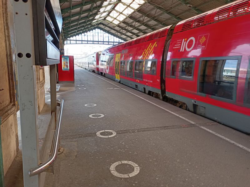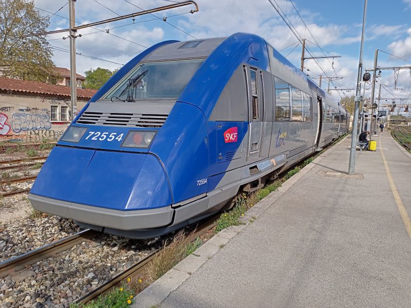 Bis Montpellier können wir die Verspätung etwas reduzieren. In Lunel werden wir allerdings auf die Seite genommen, damit ein TGV nach Paris an uns vorbei ziehen kann. In Nîmes stehen wir diesem dann kurz darauf am selben Bahnsteig gegenüber, da der TGV hier eine Haltezeit von 4 Minuten verplant hat. Trotzdem behalten wir bis zum Schluss eine geringe Verspätung bei, da wir auch in Nîmes warten müssen, bis der TGV weit genug voraus gefahren ist.