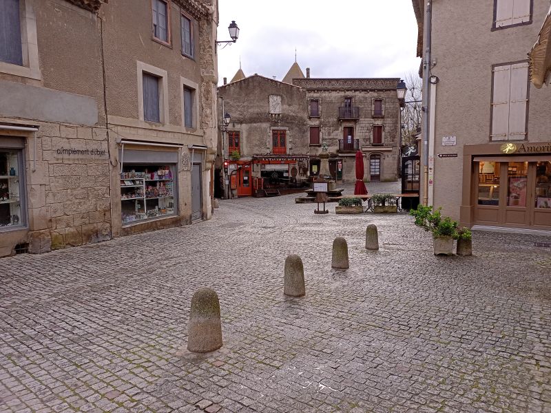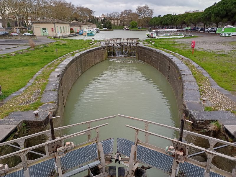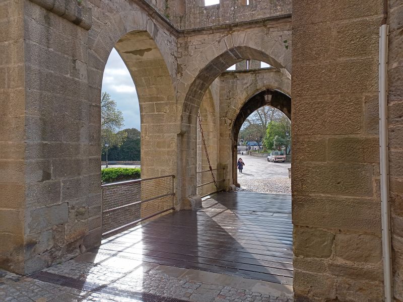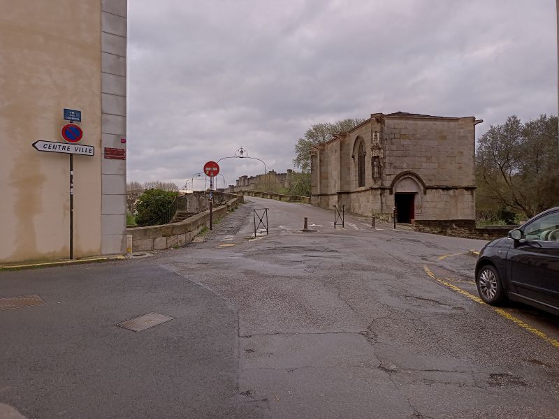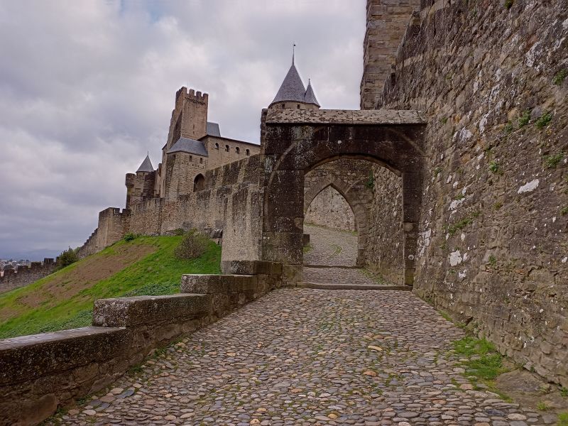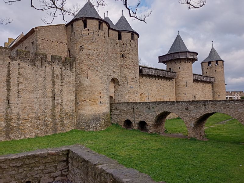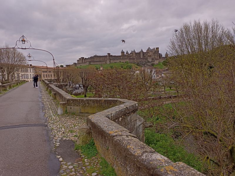 Die Burg wird von der darunter liegenden Stadt aus über die Pont Vieux („alte Brücke“) erreicht, die den Fluss Aude quert. Darauf folgt ein steiler Aufstieg entlang der Außenanlagen der Festung, die wir durch die passend benannte Porte de l’Aude betreten. Schon während des Aufstiegs bemerken wir, dass nicht nur ein starker Wind herrscht, sondern ein Sturm durch das Land tobt. In der mittelalterlichen Burg selbst ist es jedoch windstill. Die Burg versprüht einen ursprünglichen und historischen Charme (wohl auch, weil wir in der Nebensaison und am frühen Vormittag hier vorbei schauen). Wir verlassen die Burg durch das gegenüberliegende Tor, die Porte Narbonnaise. Für die Rückfahrt zum Bahnhof nutzen wir einen Stadtbus, dessen nächstgelegene Haltestelle vor dem örtlichen Gefängnis liegt, das passenderweise den Insassen Ausblicke auf die mittelalterliche Festung bietet. Beim Warten auf den Bus finden wir dann zufällig im Internet die Sturmwarnung des französischen Wetterdienstes mit Hinweisen auf mögliche Einschränkungen im öffentlichen Verkehr. Der Bus kommt trotzdem pünktlich und wenig später erreichen wir den Bahnhof.
