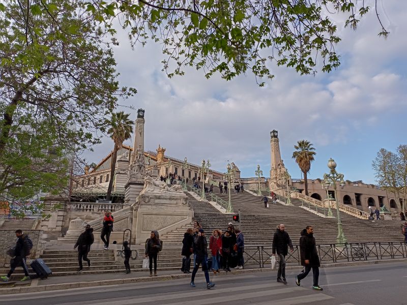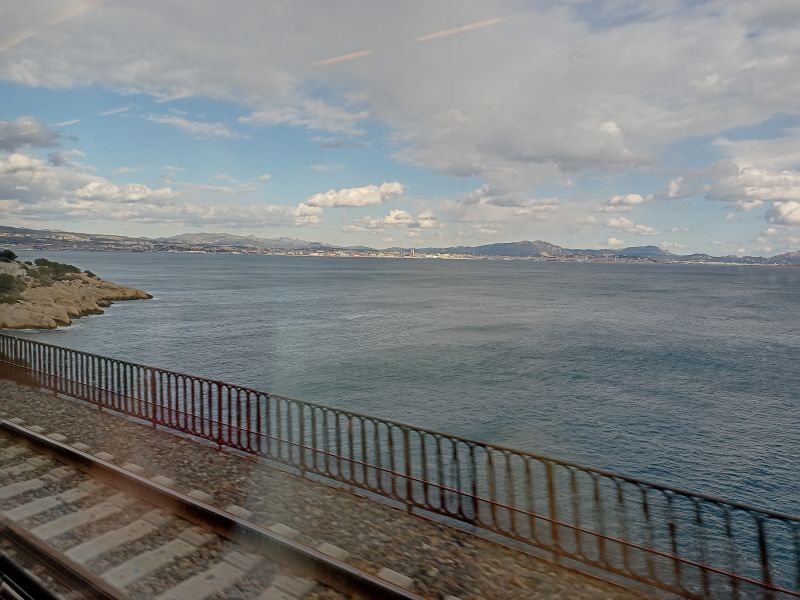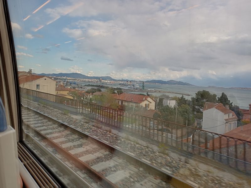 Zurück am Bahnhof wartet bereits ein AGC im Design der Region Sud auf unsere Weiterfahrt. Dieser Zug hätte uns direkt nach Marseille gebracht, wo wir uns heute Abend einquartieren werden. Allerdings fahren wir nur bis zum Halt in Miramas mit, denn von dort nach Marseille gibt es eine deutlich schönere Strecke. Wir steigen in Miramas um in einen zweiteiligen X-TER. Der X-TER ist die Diesel-Variante des Z-TER, den wir am 3. Tag zwischen Rennes und Nantes genutzt haben. Die dann folgende Fahrt empfand ich rückblickend als die schönste Fahrt der gesamten Reise. Die Strecke führt erst an verschiedenen kleineren Seen wie dem Étang de Lavalduc und dem Étang d’Engrenier vorbei. Zwischen dem Haltepunkt Croix-Sainte und dem Bahnhof Martigues quert die Strecke auf einer Hochbrücke den Canal de Caronte, der für Seefahrer vom Meer die Einfahrt in den innenliegenden großen Étang de Berre ermöglicht. Der schönste Abschnitt der Strecke liegt zwischen Carry le Rout und L’Estaque. Dort führt die Strecke malerisch direkt am Meer an der Côte bleue entlang. Passend zum Namen ist das Wasser dort tiefblau. Insgesamt zeigt die Strecke trotz vieler Tunnel durchgehend mediterranes Nebenbahn-Flair vom Feinsten und ist daher absolut sehens- und empfehlenswert. Schließlich fahren wir durch die Gleisanlagen des Frachthafens Euroméditerranée in die Stadt Marseille ein. Nach einer langen Kurve erreicht der Triebwagen den Großbahnhof Saint-Charles an den äußeren Bahnsteigen der nördlichen Nebenhalle.