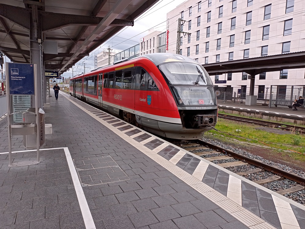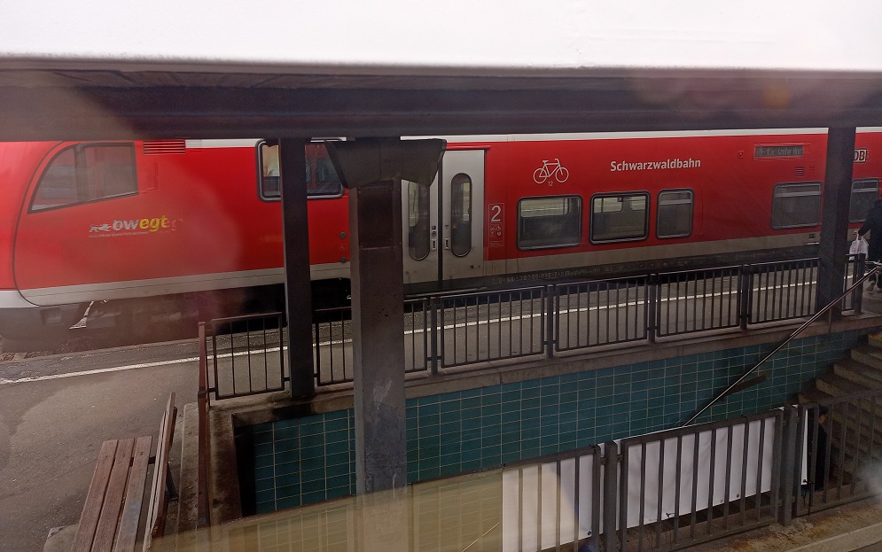 Angekommen in Karlsruhe stelle ich fest, dass eine technische Störung den Betrieb im Stadtbahntunnel lahmlegt. Verwundert stehen deshalb einige Fahrgäste an der DB-Info an, die ihnen aber auch keine Auskünfte zum innerstädtischen Verkehr erteilen kann. Wir gehen indes weiter zu unserem Abfahrtsgleis und warten auf die Schwarzwaldbahn.