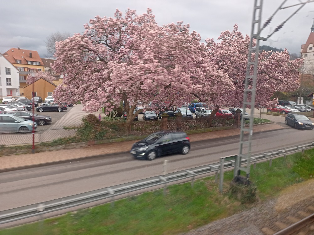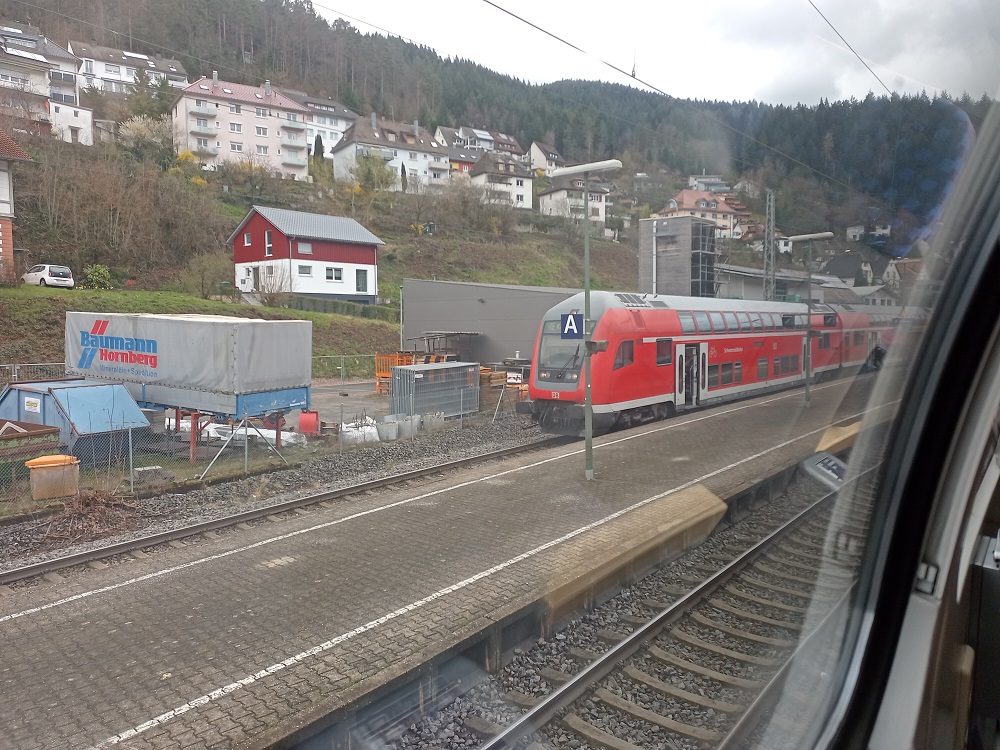 Die bisher sehr angenehme Fahrt endet vorerst im Bahnhof von Hausach, an dem der schönste Teil der Strecke erst beginnt, denn zwischen Hausach und Hornberg ist ein Baum in die Oberleitung gestürzt. Die Weiterfahrt verzögere sich gemäß Durchsage auf unbestimmte Zeit. Wir nutzen die Zeit zum Überlegen, ob wir die Streckensperrung über Freudenstadt und die Gäubahn oder über Karlsruhe und Stuttgart umgehen sollen. Doch bevor wir uns für eine Alternative entschieden haben, wird die Streckensperrung nach 20 Minuten aufgehoben. Da die Strecke derzeit aber nur eingleisig befahrbar ist, müssen wir noch den Gegenzug abwarten, wodurch sich unsere Verspätung um weitere 25 Minuten erhöhen wird.