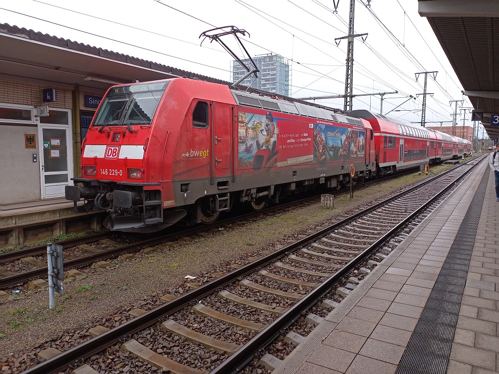 Die Fahrt endet schließlich mit rund 55 Minuten Verspätung vorzeitig in Singen. Die Fahrgäste werden auf den nachfolgenden RE 2 verwiesen, der im Blockabstand folgt. Ungünstig ist dabei, dass der nächste Zug nur aus 3 Wagen gebildet wird, während unser bisheriger Zug mit 4 Wagen ausgestattet war. Insgesamt müssen sich daher die Fahrgäste aus 7 Wagen zur Schulschlusszeit in den 3-Wagen-Zug drängen. Die Doppelstockwagen erweisen sich dabei allerdings als sehr geräumig, sodass sogar ein Durchkommen durch den Gang im Unterdeck während der Fahrt möglich ist.