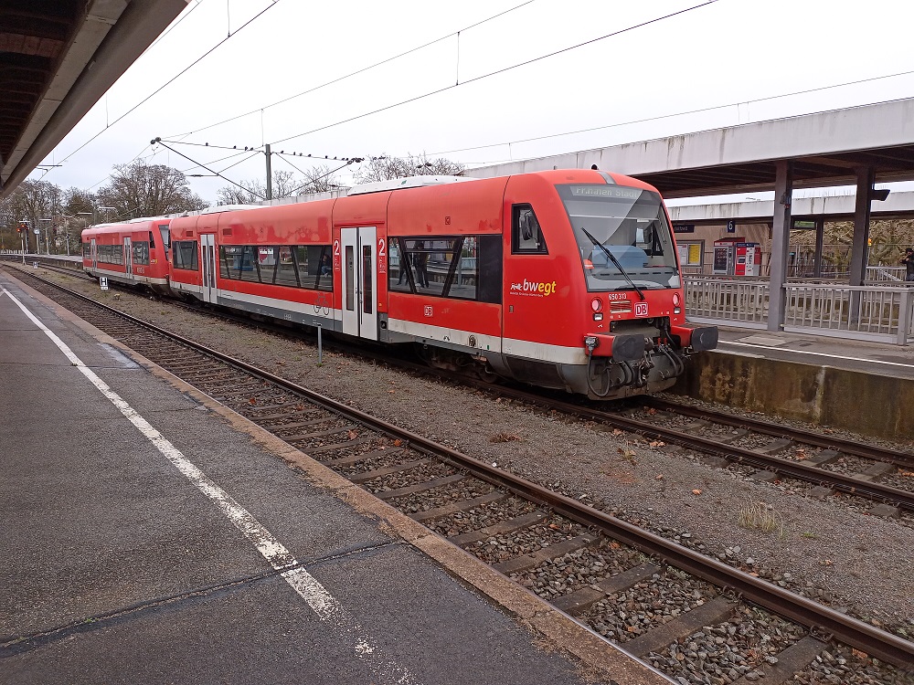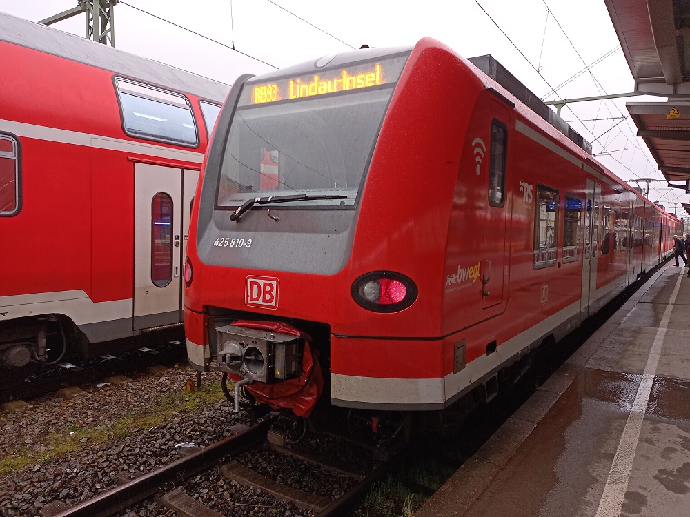 Unterwegs kommt uns die Folgeleistung des IRE 3 entgegen, den wir eigentlich nutzen wollten. Statt eines Dosto-Park, der mit einer 245 bespannt wird, wäre es ein Solo-612 gewesen. Daher freuen wir uns nun umso mehr über die bequeme Fahrt im gut besetzten Regio-Shuttle. An diesem Tag war dies der einzige Umlauf, der auf der RB31 mit der Baureihe 650 gefahren wurde. Die übrigen Umläufe waren mit durch die inzwischen planmäßigen dort verkehrenden LINT besetzt. Durch die Spurtstärke und die kurzen Türöffnungszeiten können wir mehrmals kleinere Verspätungen wieder heraus fahren und kommen so insgesamt eine Minute vor Plan in Friedrichshafen an.