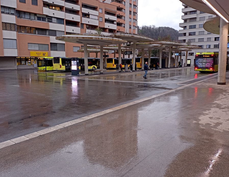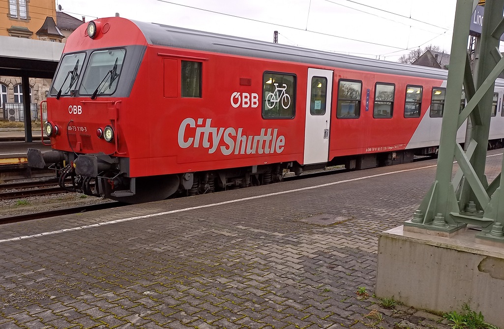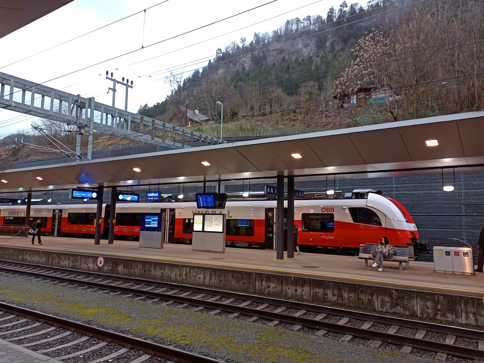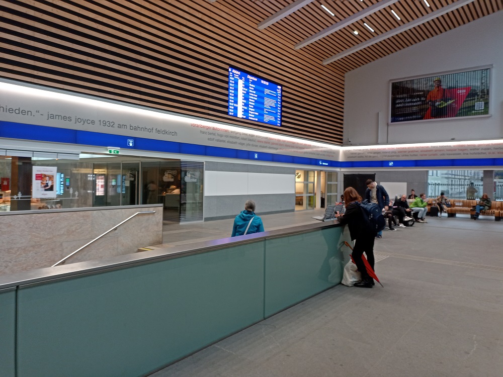 Der Regen hat zwar bis zur Ankunft am letzten Umsteigebahnhof in Feldkirch bereits nachgelassen, allerdings ist die Umsteigezeit zu kurz um einen kurzen Ausflug in die Stadt zu unternehmen. Andererseits ist die Wartezeit aber auch zu lange, um am Bahnsteig auf die Weiterfahrt zu warten. Daher erkunden wir ein wenig den Bahnhof.