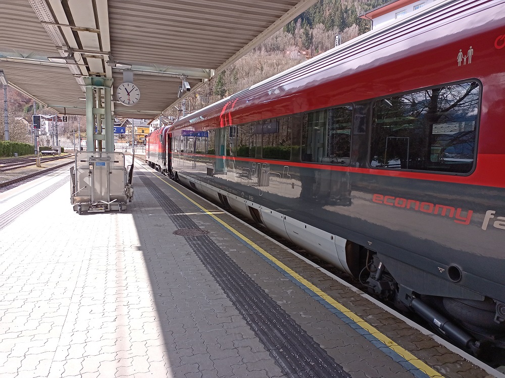 Nach einer guten Stunde erreicht der Saison-Verstärker nach Wien den Bahnhof von Zell am See und nimmt uns mit nach Bischofshofen. Dort steht ein weiterer Umstieg an. Der Zug ist dem „traditionellen“ Bettenwechsel in den Skigebieten am Samstag entsprechend sehr gut besetzt.