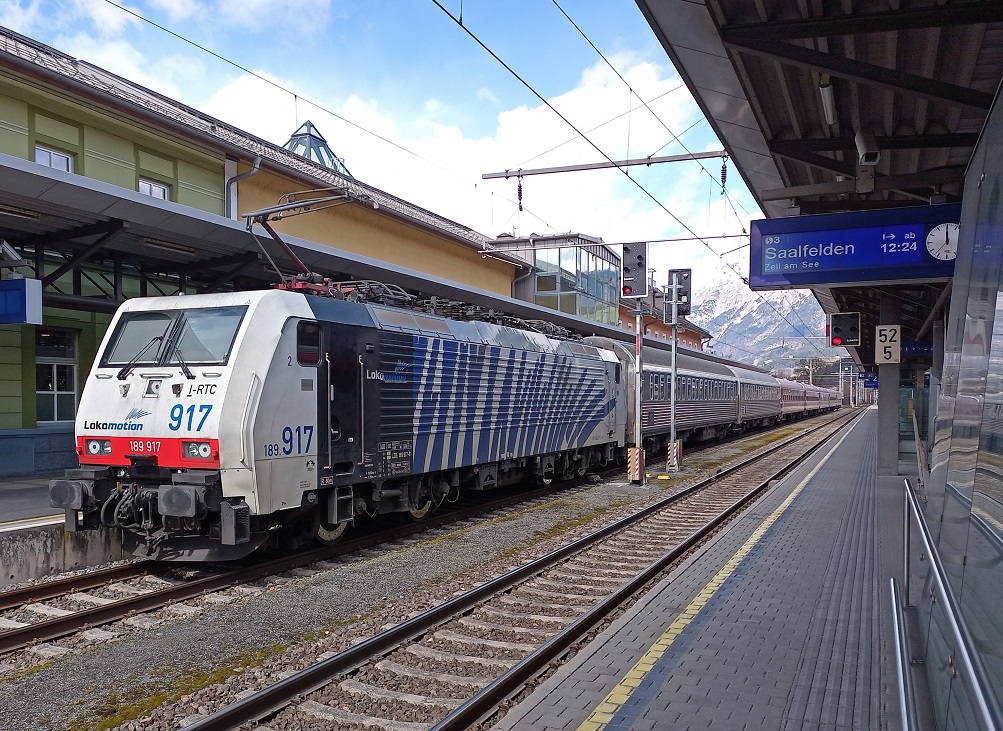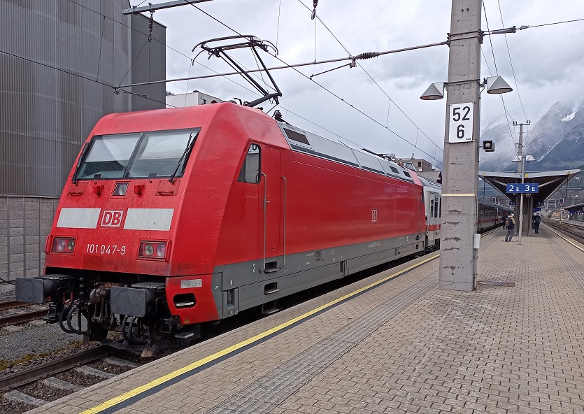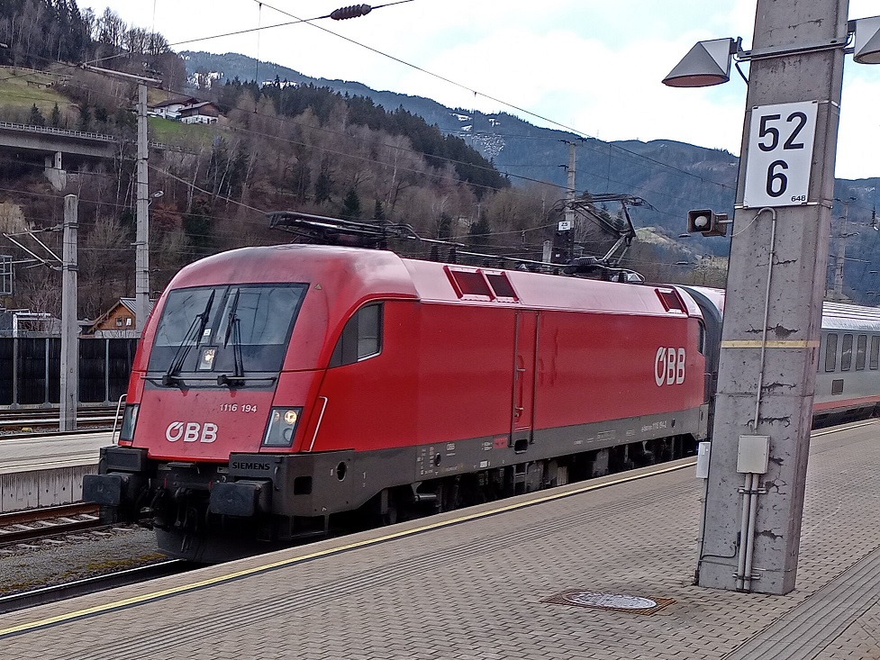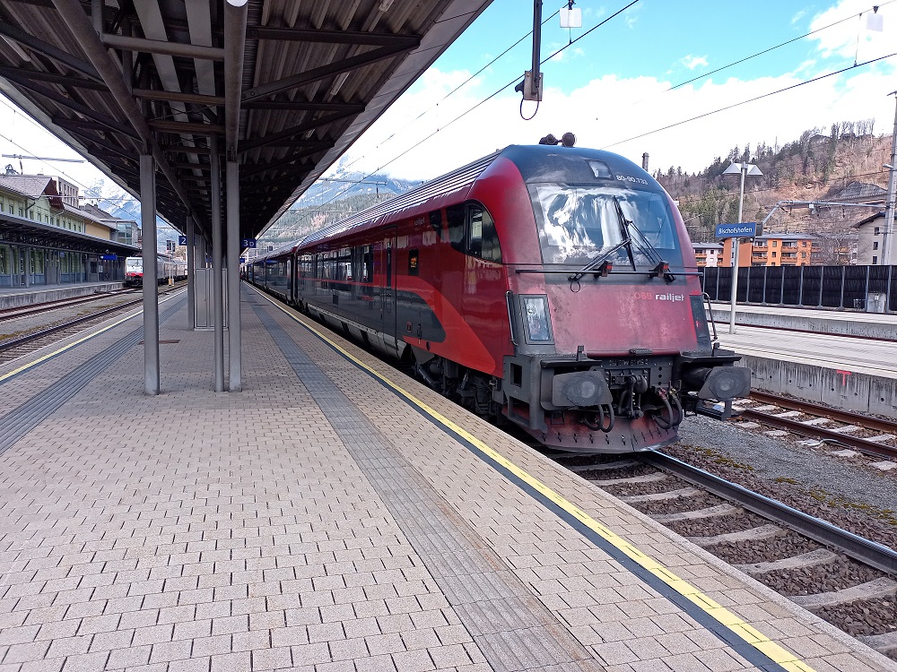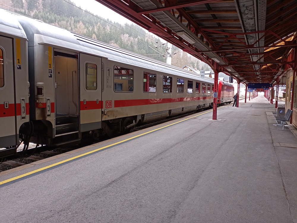 Zurück am Bahnhof erwarten wir schon bald den EC 217. Normalerweise sollte dieser Zug schon mehrere hundert Kilometer zurückgelegt und dabei u. a. den nächstgelegenen Fernbahnhof in der Heimat, Neustadt an der Weinstraße, bedient haben. Aber an diesem Tag verhindert eine Baustelle den durchgehenden Zuglauf von Saarbrücken bis nach Graz. Die Fahrt wird stattdessen aufgeteilt: Auf dem Abschnitt Saarbrücken – München fährt ein Ersatzzug und der eigentliche EC 217 wird an diesem Tag als österreichischer Binnenzug ab Salzburg Hbf gefahren. Der Zug trifft pünktlich zum Fahrtrichtungswechsel in Bischofshofen ein. Trotz des verkürzten Laufwegs wird die planmäßige DB-Garnitur eingesetzt.