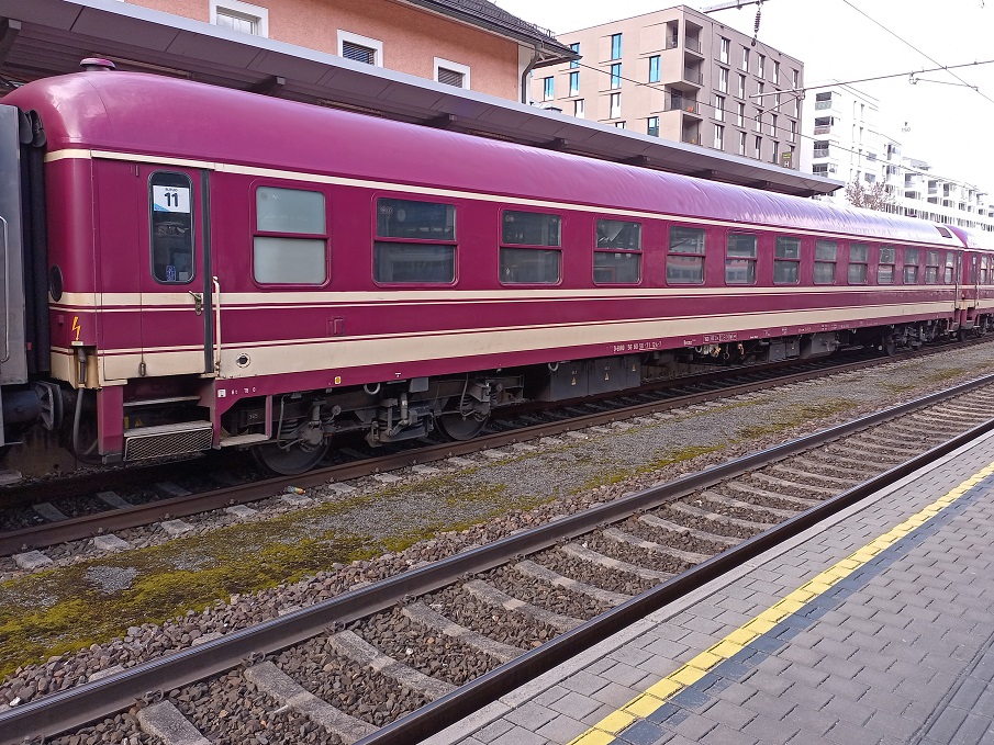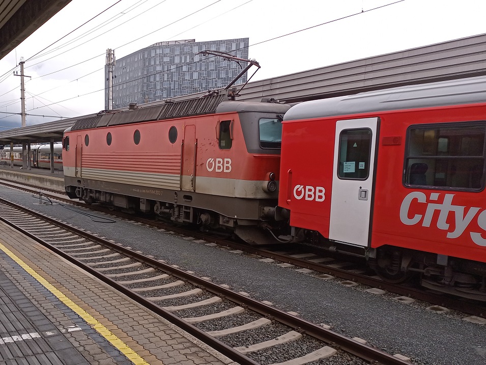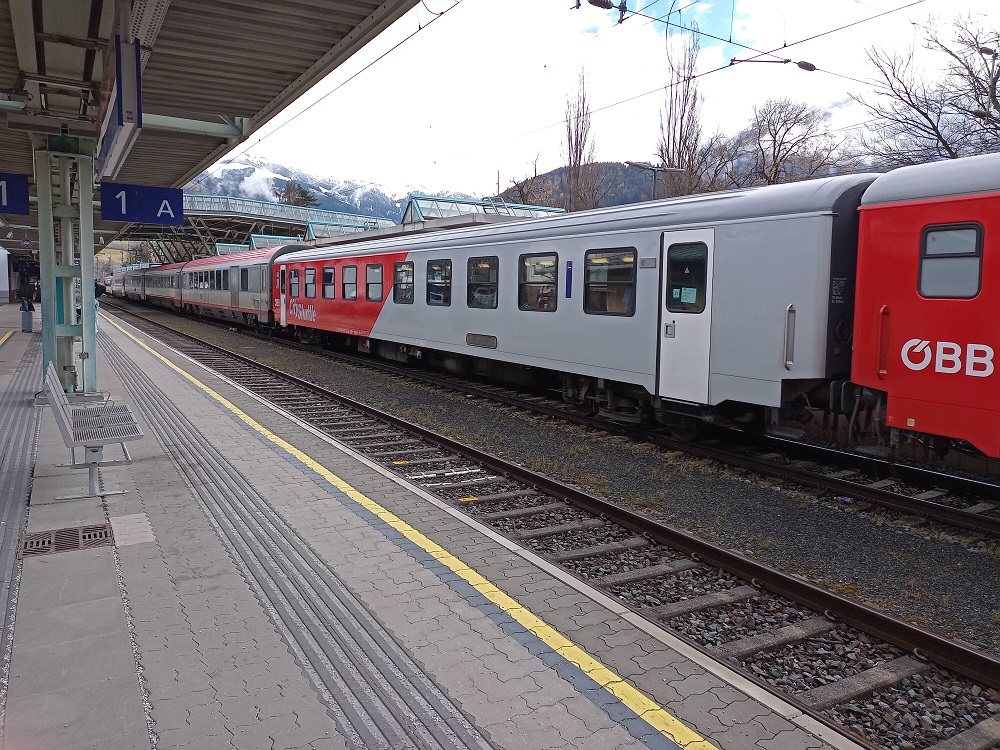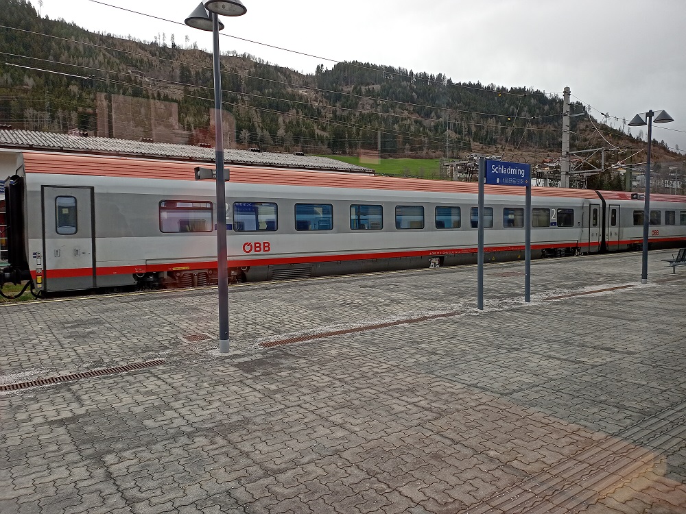 In Bischofshofen ergibt sich ein einstündiger Umsteigeaufenthalt, bis der nächste Fernzug nach Graz eintreffen wird. Nachdem der Railjet den Bahnhof verlassen hat, fällt unser Blick auf eine weitere interessante Zugkomposition. An Gleis 1 steht ein Nachtzug abgestellt.