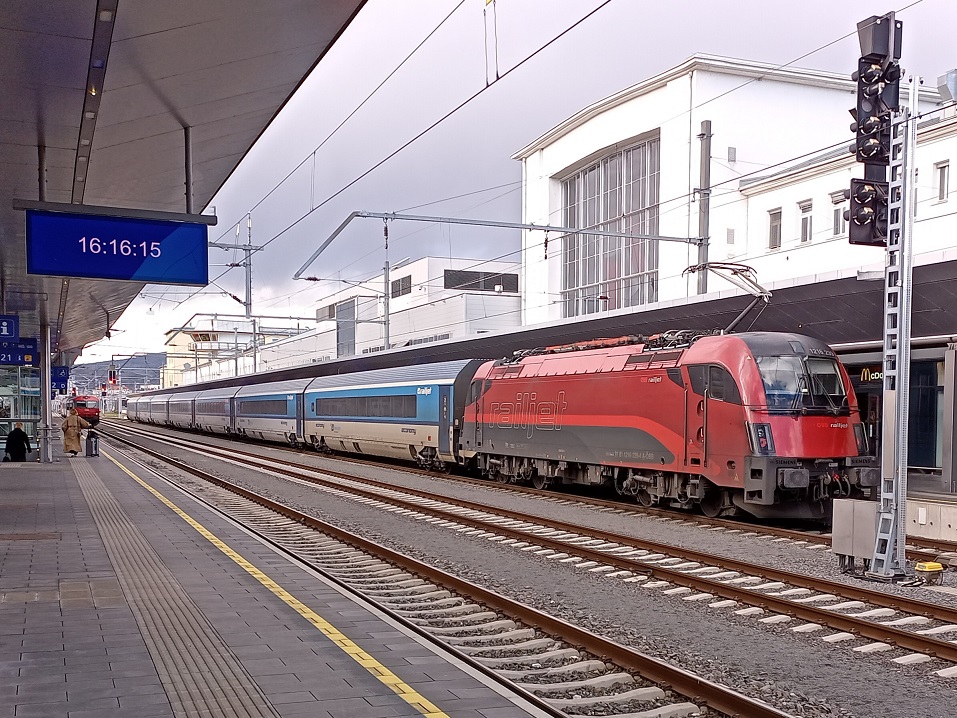 Bild 2-25: Kurz vor der Abfahrt trifft am Bahnsteig gegenüber ein EC aus Klagenfurt zu einem Korrespondenzhalt ein.