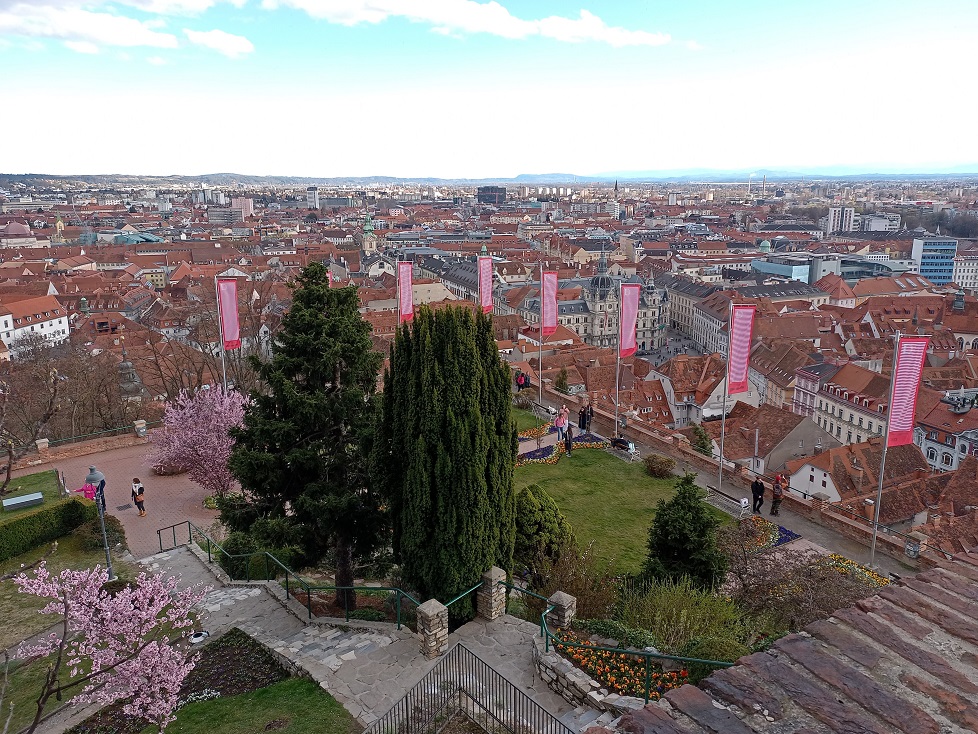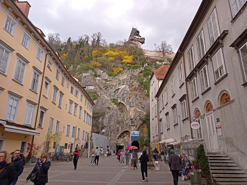 Graz ist die zweigrößte Stadt des Landes und bietet vom mitten in der Innenstadt gelegenen Schlossberg aus einen schönen Rundblick. Allerdings muss dafür zunächst der Aufstieg bewältigt werden. Dafür stehen drei Möglichkeiten zur Auswahl: Eine Bergbahn (die wir auf der Rückfahrt nutzen werden), ein Aufzug und eine Treppe. Unsere Wahl fällt nach der langen Fahrt natürlich auf die Treppe.