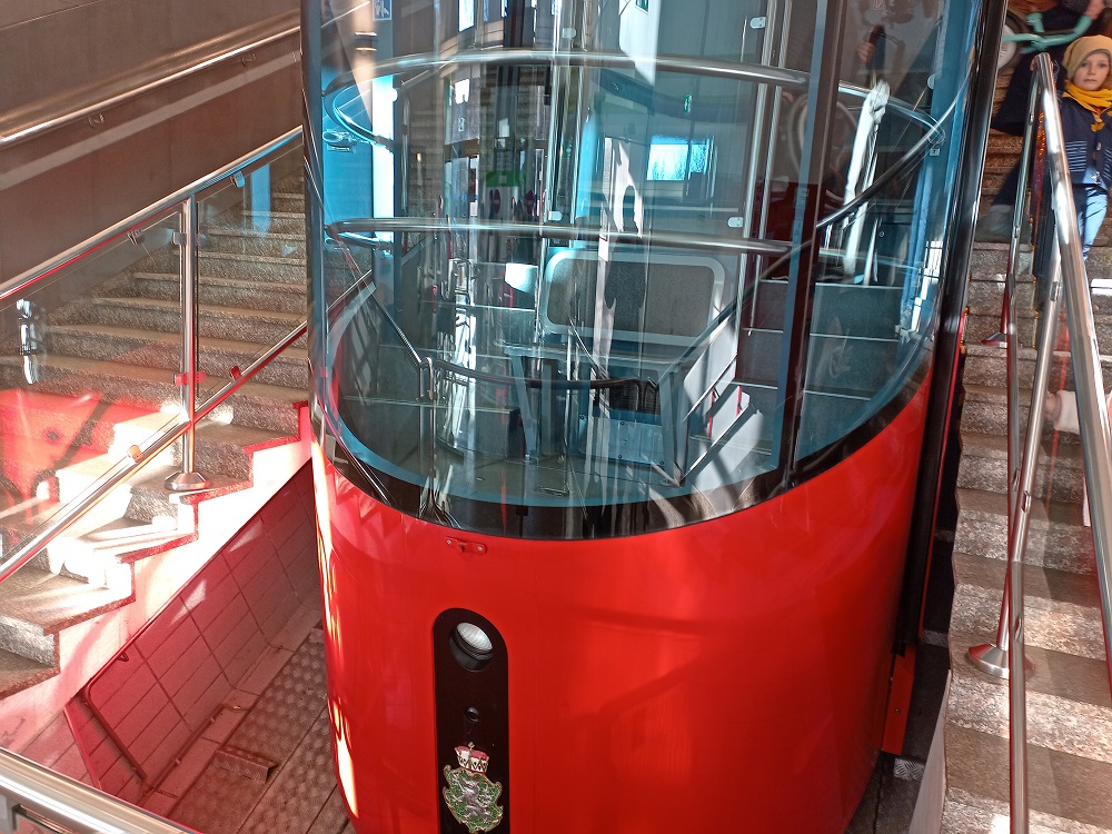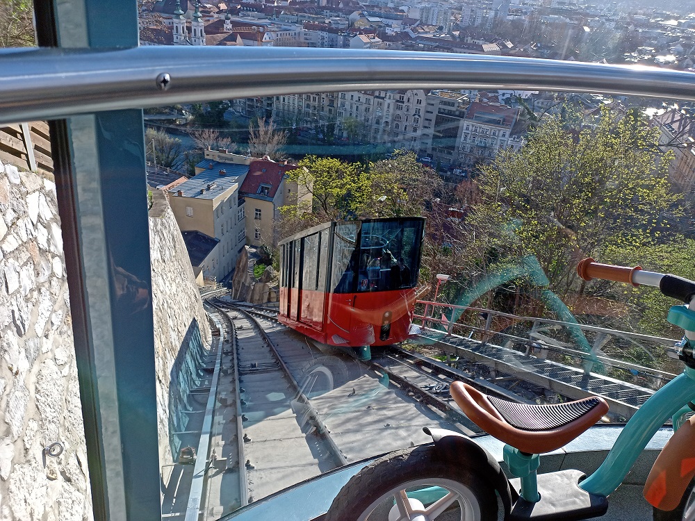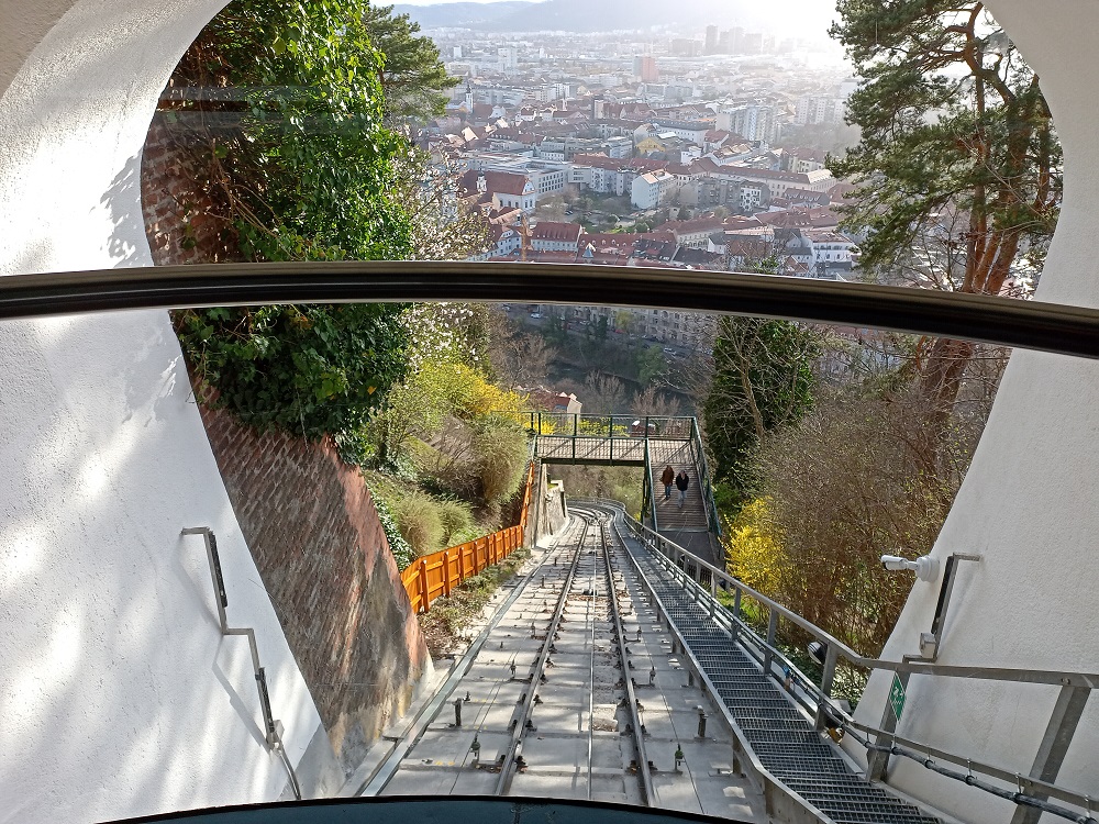 Bild 2-36: Der Abstieg erfolgt mit der Schlossbergbahn. Das moderne Design der Fahrzeuge ermöglicht in der ersten Reihe freie Sicht auf die Strecke.