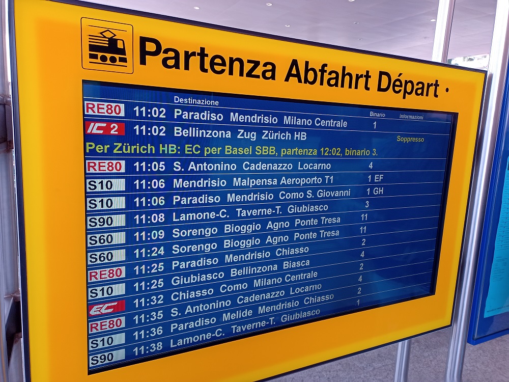 Nun, Ausfälle kommen vor. In Anbetracht des dichten Angebots in der Schweiz ist das normalerweise kein Problem, denn der nächste Zug lässt nicht lange auf sich warten. Zunächst will sich mir jedoch keine Ursache für den Ausfall erschließen, denn bei Personal- oder Fahrzeugmangel wäre der Ausfall bei der Ankunft eine Stunde früher bereits bekannt gewesen. Die Situation deutete eher auf eine Infrastrukturstörung hin. Nach einem Besuch im Reisezentrum sollte sich diese Vermutung dann bestätigen: Im Bereich Altdorf besteht eine Oberleitungsstörung. Der Streckenabschnitt zwischen Erstfeld und Flüelen ist daher ebenso wie der Gotthard-Basistunnel nicht befahrbar. Damit ist die gesamte Gotthard-Achse derzeit voll gesperrt. Fahrgäste in Lugano werden zu diesem Zeitpunkt auf den nächsten EC nach Basel verwiesen in der Hoffnung auf eine baldige Störungsbeseitigung. 20 Minuten vor der Abfahrt ändern die Anzeiger am Bahnsteig dann das Ziel des Zuges von Basel zu Erstfeld. Darüber wird uns später das Zugpersonal aufklären.