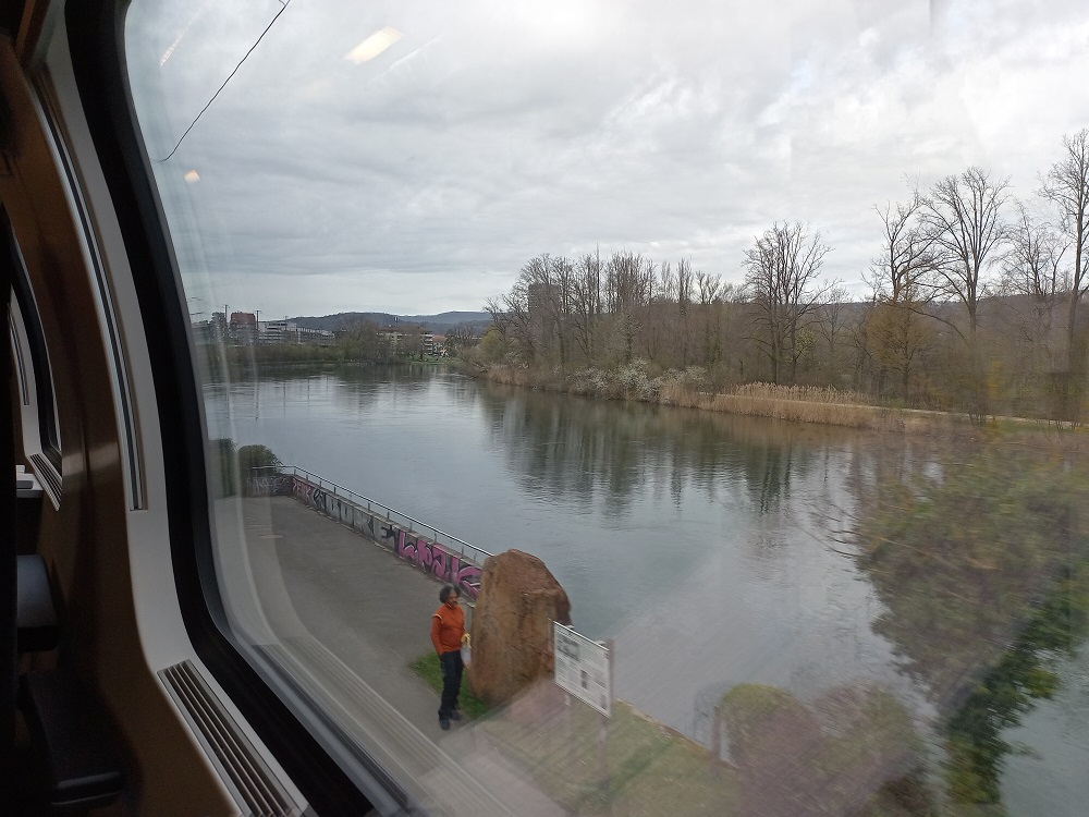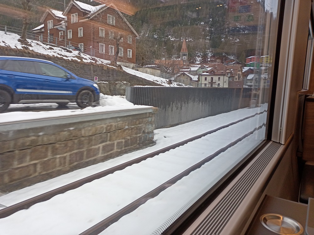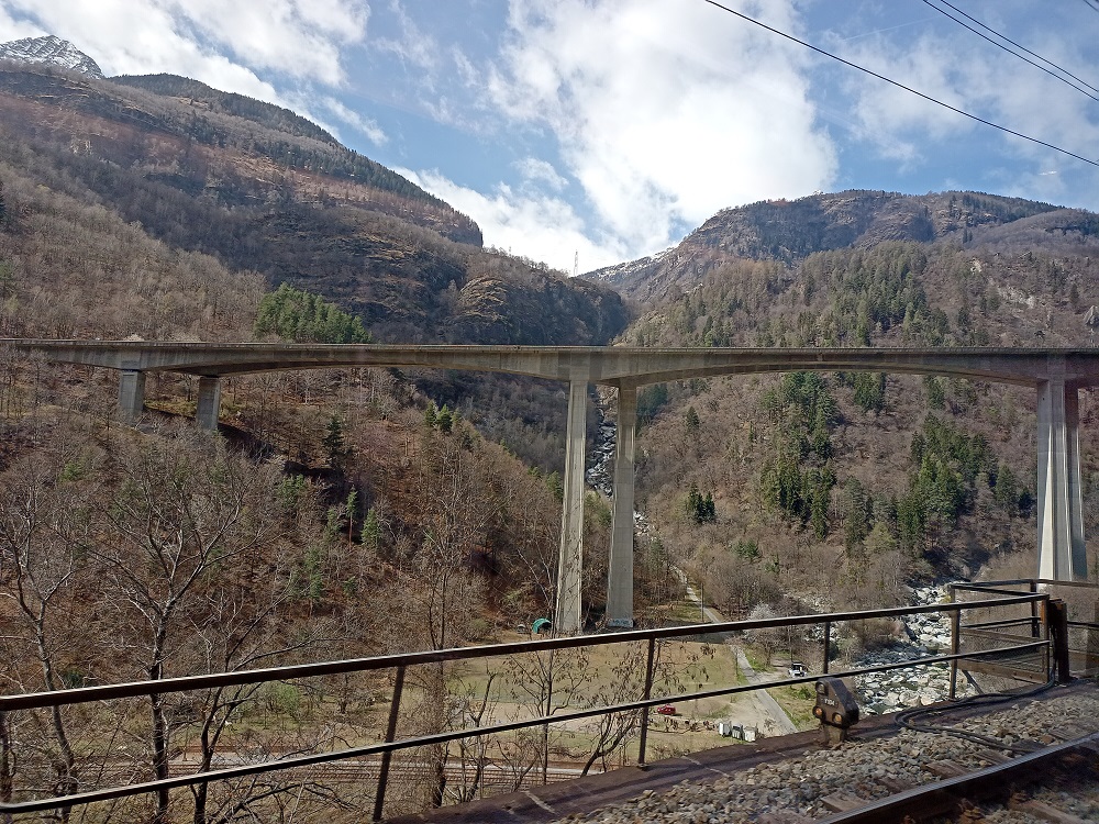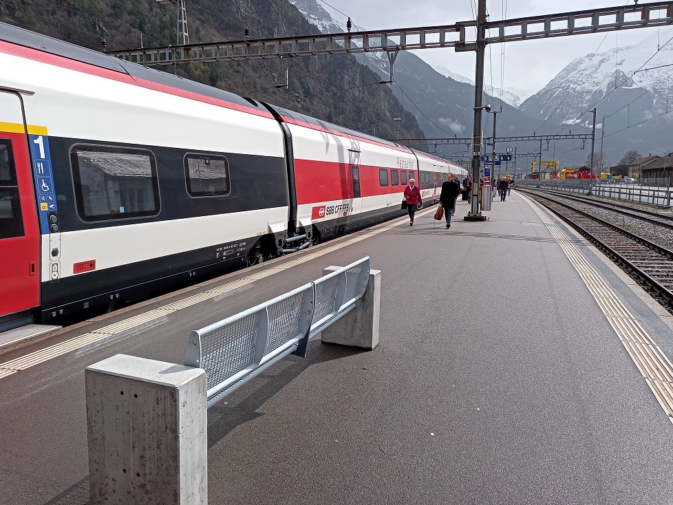 Kurz nach der Abfahrt in Bellinzona kommt der Zugbegleiter vorbei und geht auf die individuellen Reisewege der Fahrgäste ein. Ich teile mit, dass wir heute noch bis nach Karlsruhe wollen. Der Zugbegleiter verweist noch einmal darauf, dass wir nun zunächst über die Bergstrecke nach Erstfeld fahren und hoffen, dass es dann dort schon wieder weiter geht. Während wir die Situation gelassen nehmen und uns (auch auf Anraten des Zugbegleiters) der schönen Aussicht erfreuen, steht eine wohlhabende Mitreisende in meinem Wagen ordentlich unter Stress, denn sie müsse um 17:00 eine teure Abendveranstaltung in Basel erreichen.