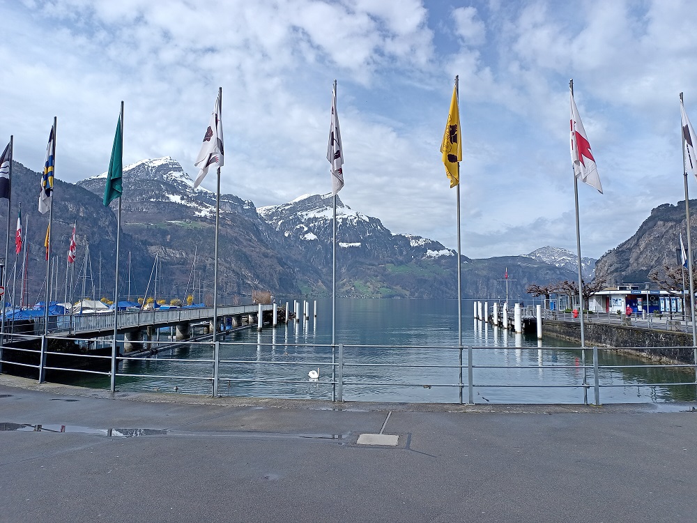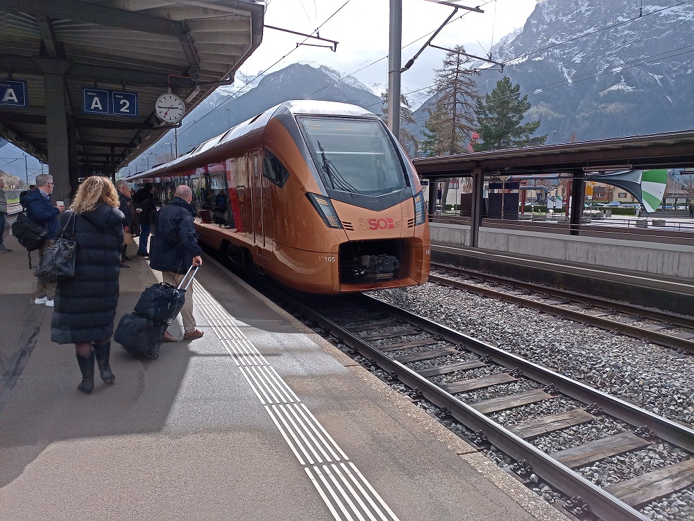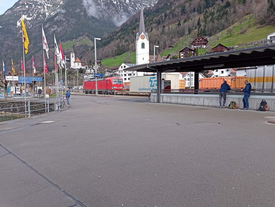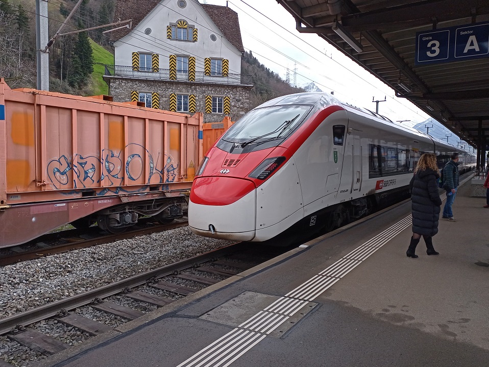 Die Reisenden werden auf den IR 46 verwiesen, der um 14:34 nach Zürich fahren soll. Die vornehme Dame aus dem Eurocity ist darüber aufgrund der geringen Aufenthaltsqualität in Erstfeld nicht wirklich erfreut. Wir verlassen daher den Bahnsteig in Richtung Bahnhofsgebäude. Vor dem Bahnhof wartet ein Bus. Die Fahrerin erklärt, dass sie auf dem Busnotverkehr eingesetzt wird, der auf die andere Seite der Störung nach Flüelen fährt. Dort würden wir die S-Bahn nach Luzern erreichen und mit Umstieg in Arth-Goldau so eine Stunde eher in Zürich ankommen. Auf meine kritische Nachfrage, ob wir die bereits in 14 Minuten abfahrende S-Bahn noch erreichen würde, antwortet sie gelassen, das wir das noch schaffen werden. Der Bus füllt sich dieser Aussage entsprechend schnell und kann nicht alle Fahrgäste aus dem EC mitnehmen. Als keine Fahrgäste mehr in den Bus hinein passen, fahren wir los in Richtung Flüelen. Besonders schnell kommen wir allerdings nicht voran, denn in der Ortsdurchfahrt von Erstfeld fahren wir einem Postauto hinterher und nach der tatsächlich zügigen Fahrt über die Autobahn an Altdorf vorbei erwartet uns noch ein vorausfahrender Traktor auf der Straße zum Bahnhof in Flüelen. Dort angekommen schließen sich die Türen der am Hausbahnsteig wartenden S-Bahn genau in dem Moment, in dem die Busfahrerin vor dem Bahnhof die Türen öffnet. Die Verärgerung der Fahrgäste bekommt die anwesende Fahrgastlenkerin der SBB leider direkt zu spüren. Nachdem sich die Reisenden etwas beruhigt haben, erklärt sie die Situation: Die Störung war um 14:00 beendet, als wir gerade mit dem Bus auf der Autobahn unterwegs waren. Der Mitarbeiterin in Flüelen hat man aber nicht mitgeteilt, dass noch ein Bus aus Erstfeld kommt. Hätte sie das gewusst, dann hätte sie die S-Bahn noch kurz zurückgehalten. So bleibt nun das Warten auf den IR 46, den wir auch in Erstfeld bereits erreicht hätten.