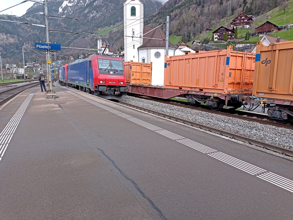 Wir müssen an manchen Stellen kurz anhalten und auf die Räumung des vorausliegenden Streckenblocks warten, kommen aber insgesamt gut voran und die Prognose für die Ankunftszeit erweist sich als recht genau, denn um 13:50 erreichen wir Erstfeld. Leider ist die Störung aber zu diesem Zeitpunkt noch nicht behoben, sodass die Verkehrsleitung entscheidet, unseren Zug in Erstfeld verenden zu lassen.