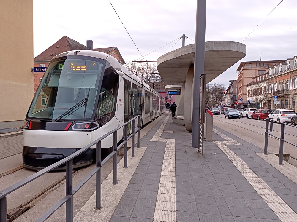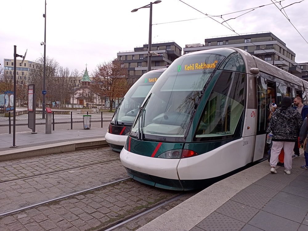 Im Stadtgebiet Kehl sind die Haltestellenansagen „zweisprachig“, wobei die zweite Sprache eine nette Parodie des badischen Dialekts darstellt. Am Bahnhof Kehl besteht für Reisende mit Tram-Fahrkarte und Deutschland-Ticket ein an diesem Tag zahlreich genutzter Anschluss zu einem hier einsetzenden Verstärkerzug der RB 25 nach Offenburg. Wir bleiben allerdings bis zur Endhaltestelle am Rathaus in der Bahn.