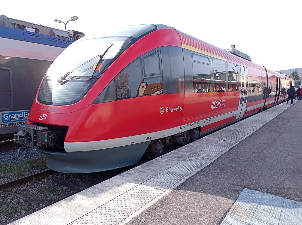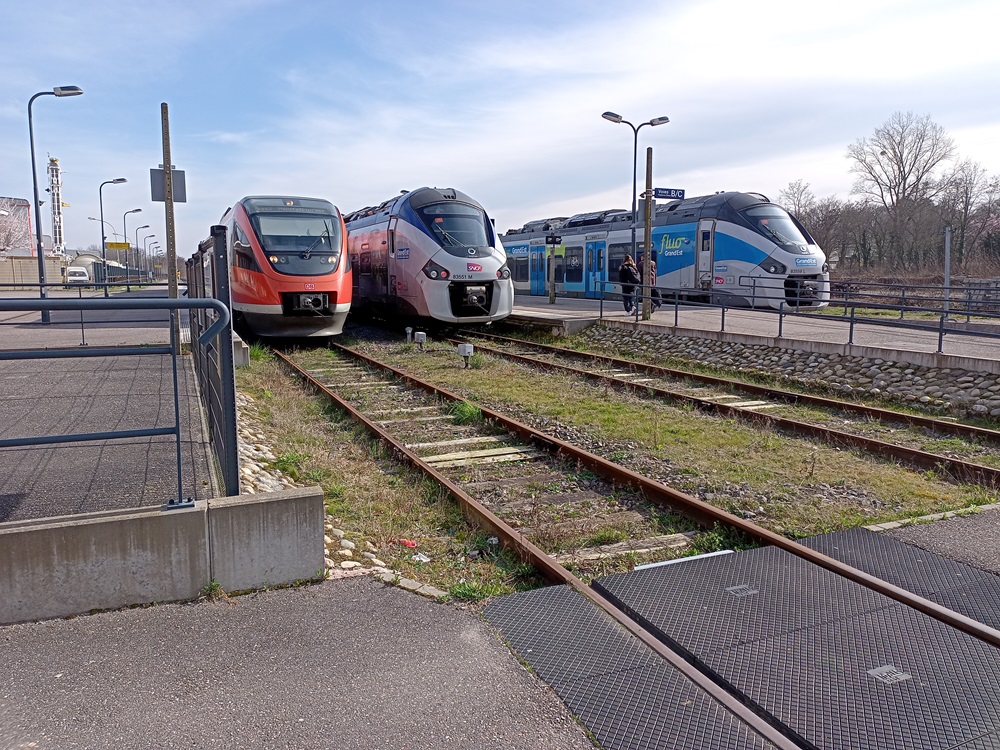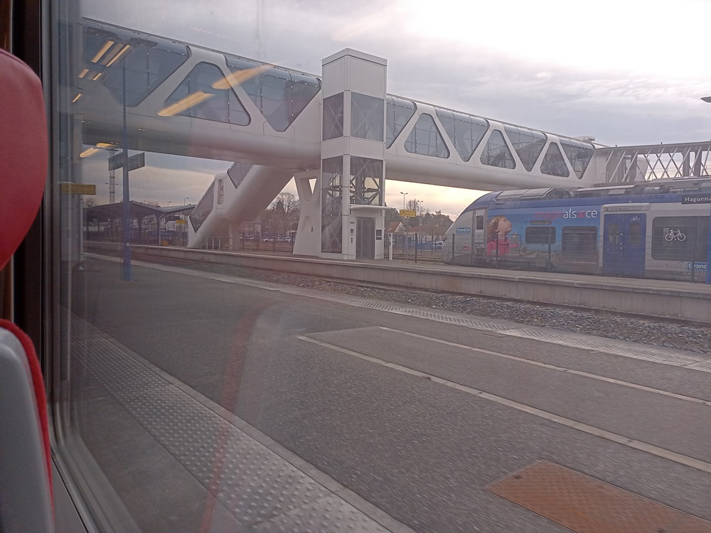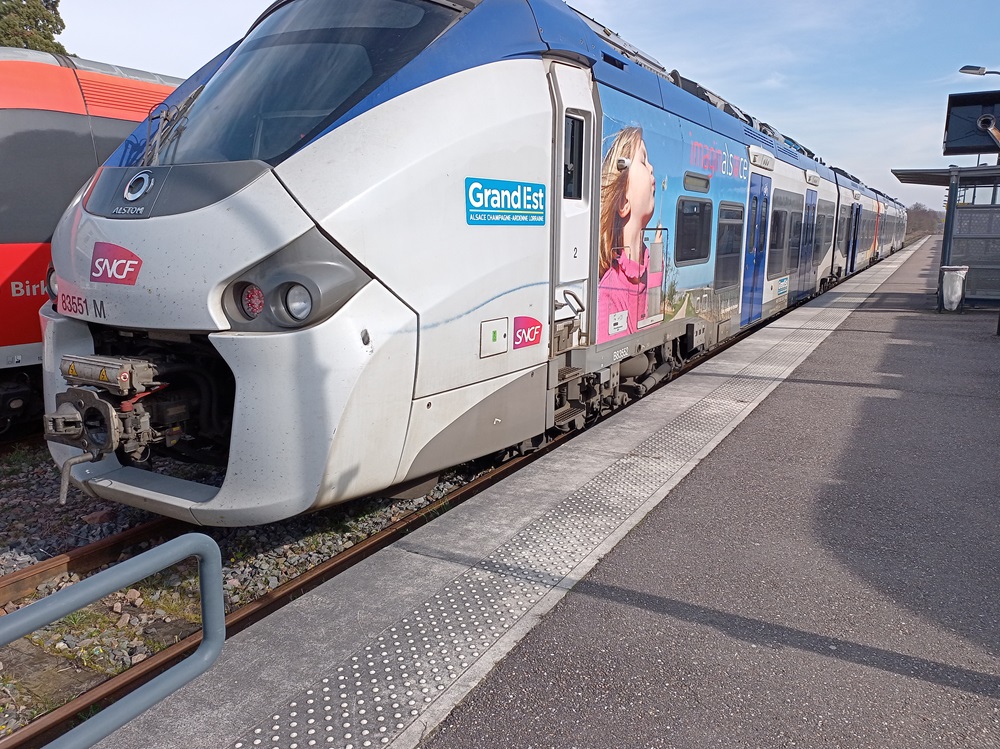 In Wissembourg steigen wir um in einen modernen Régiolis-Triebwagen der SNCF. Fahrzeuge dieser Bauart mit einer besonderen Ausrüstung für den grenzüberschreitenden Verkehr sollen den heute noch notwendigen Umstieg in Wissembourg in einigen Jahren obsolet werden lassen. Dann soll stündlich der durchgehende Verkehr von Neustadt nach Strasbourg aufgenommen werden, wobei ein Kopf machen in Wissembourg aber weiter notwendig sein wird. Dennoch können Reisende dann in einem Fahrzeug durchgehend aus der Pfalz in die Hauptstadt der Region Grand-Est reisen. Noch stehen die neuen Fahrzeuge allerdings in einer Abstellanlage in Lauterbourg und warten auf die deutsche Zulassung.
