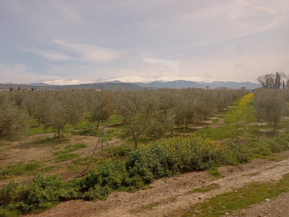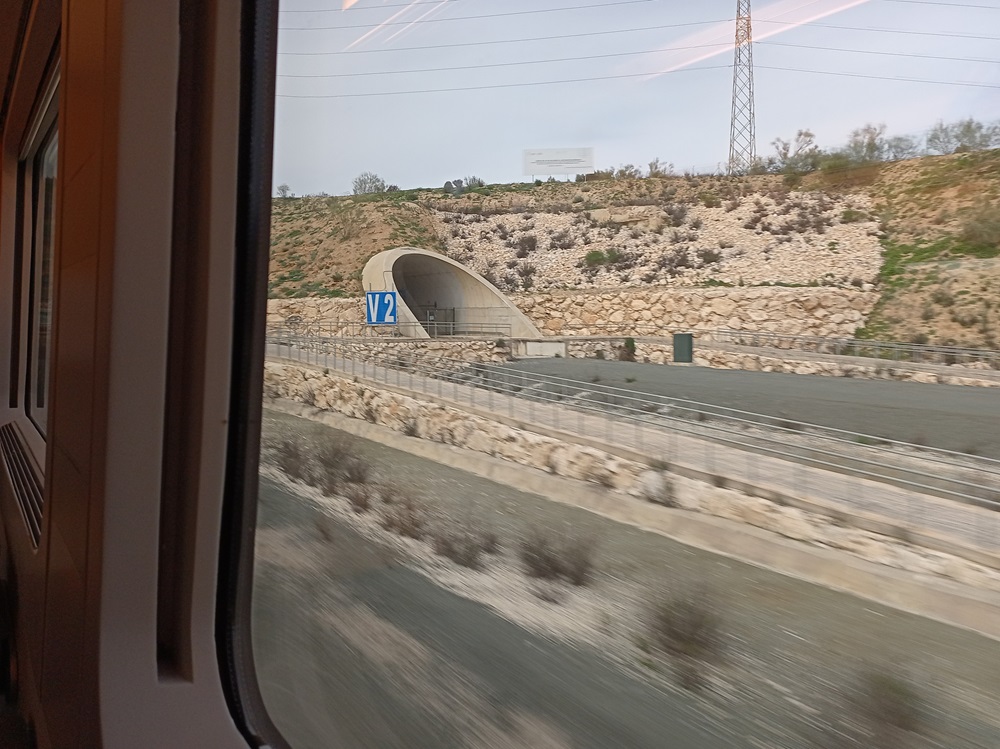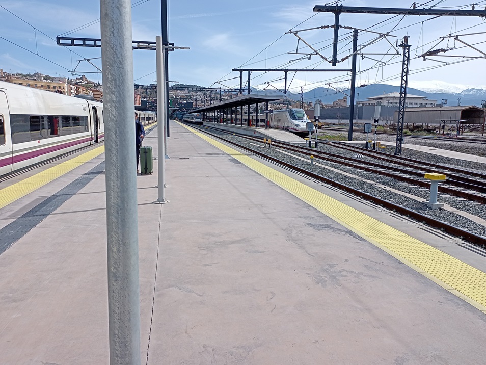 Kurz nach 12 Uhr erreicht der Zug das Gleisdreieck von Moreda. Dort verzweigt sich die historische Hauptstrecke aus Richtung Madrid in zwei Äste nach Granada und Almería. Die Strecke nach Madrid wird auf dem Abschnitt bis zum nächsten Knotenpunkt Linares-Bazea heute jedoch nur noch von einem Intercity-Zugpaar Madrid – Almería am Tag bedient. Der Verkehr nach Granada wurde vollständig auf die neu gebaute Hochgeschwindigkeitsstrecke über Córdoba und Antequera verlagert. Die meisten Züge nutzen in Moreda daher aktuell die Verbindungskurve zwischen den beiden Streckenästen nach Almería und Granada. Langfristig ist zu befürchten, dass die RENFE nach Inbetriebnahme der Schnellfahrstrecke bis Almería auch das noch verbleibende IC-Zugpaar einstellt, sodass die ehemalige Hauptstrecke dann ohne Verkehr verbleiben würde. Im Zulauf auf Granada fahren wir an einem neu gebauten Spurwechselhäuschen vorbei, das ab Anfang 2025 von einem zusätzlichen Alvia-Zugpaar Madrid – Almería genutzt werden kann, um von der normalspurigen Schnellfahrstrecke auf die breitspurige Strecke Granada – Almería über zu gehen. Dem Bahnhof Granada nähern wir uns u. a. wegen dieser Baustelle sehr langsam, erreichen ihn aber auf die Minute pünktlich um 12:55.