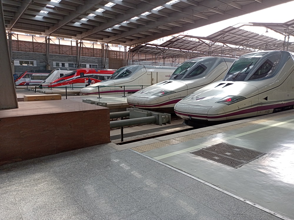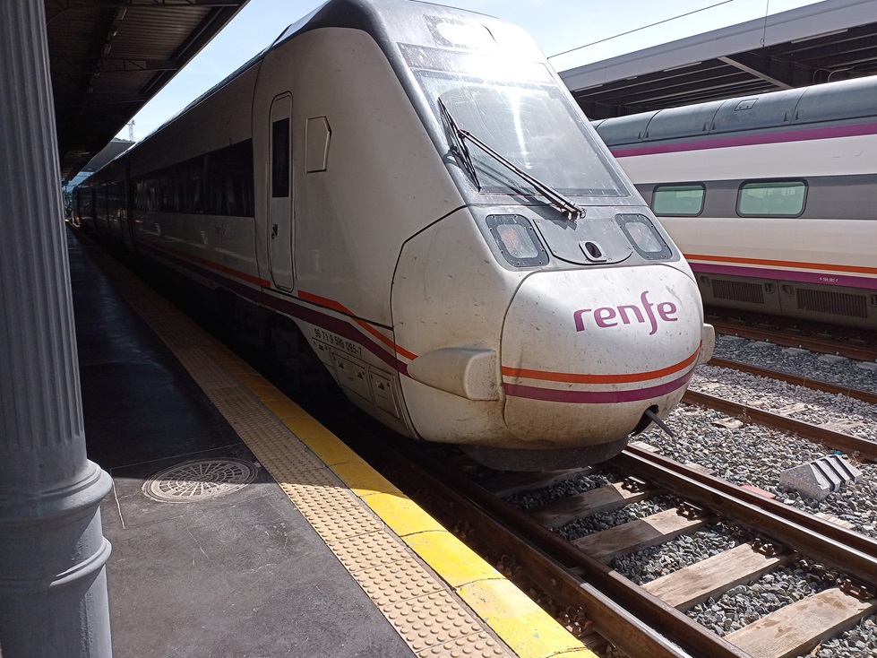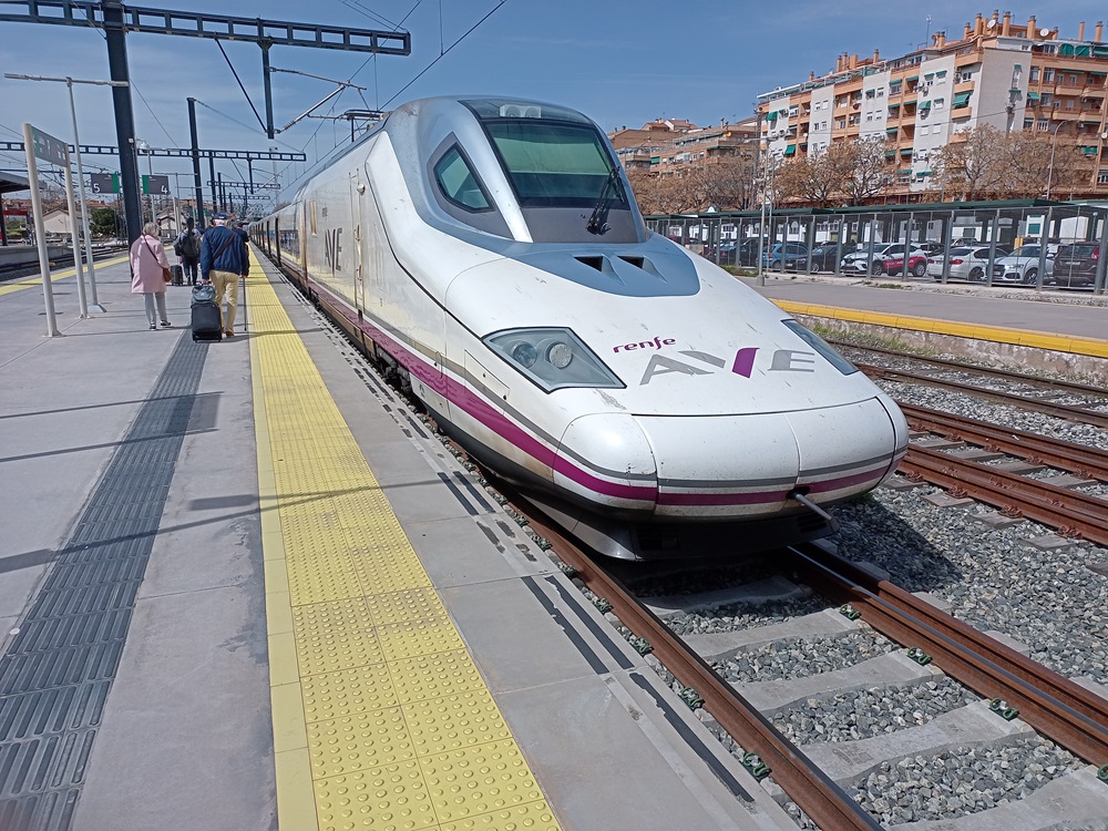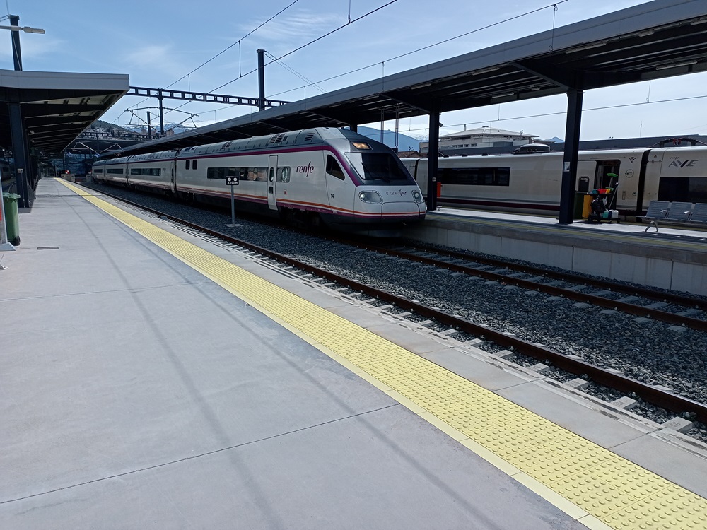 In Granada hätten wir uns mit der Alhambra eine noch größere und beeindruckendere Palast- und Festungsanlage anschauen können. Da wir allerdings an diesem Tag bereits die Alcazaba von Almería besucht haben und der Besuch der stark frequentierten Alhambra im Gegensatz dazu kostenpflichtig und limitiert ist, verzichten wir darauf und fahren direkt weiter nach Málaga. Der Fahrplan der Züge aus Almería ist in Granada auf die abgehenden Hochgeschwindigkeitszüge abgestimmt, sodass sich ein passender 20-Minuten-Anschluss an einen der drei täglichen Avant-Züge nach Málaga ergibt. Allerdings konnte ich diesen Anschluss vorab nicht durchgehend in einer Fahrkarte buchen, da das RENFE-Buchungssystem den Anschluss zwar ausgibt, aber im letzten Buchungsschritt bei der Bezahlung mit einem Fehler abbricht. Separat konnten die Fahrkarten für beide Züge aber problemlos gekauft werden – natürlich mit dem Risiko, auf den Kosten einer weiteren Avant-Fahrkarte für einen späteren Zug sitzen zu bleiben, wenn sich der Zubringer zu stark verspätet. An diesem Tag hat der Anschluss aber funktioniert. Von den ca. 50 Reisenden aus dem Media Distancia stellen sich neben uns noch einige weitere in die Schlange der Gepäckkontrolle, die zügig voran schreitet. Um 13:05 stehen wir somit auf dem Bahnsteig. Der RENFE-Mitarbeiter, der die Fahrkarten scannt, gibt allerdings allen Fahrgästen den wichtigen Hinweis „último tren“ mit. Denn der eigentlich für unseren Zug vorgesehene Avant-Triebwagen, der im Kopfbahnhof am Prellbock steht, ist weiter vorne im Gleis durch eine Ente zugeparkt. Der Talgo übernimmt heute die Leistung nach Málaga als Ersatzzug.