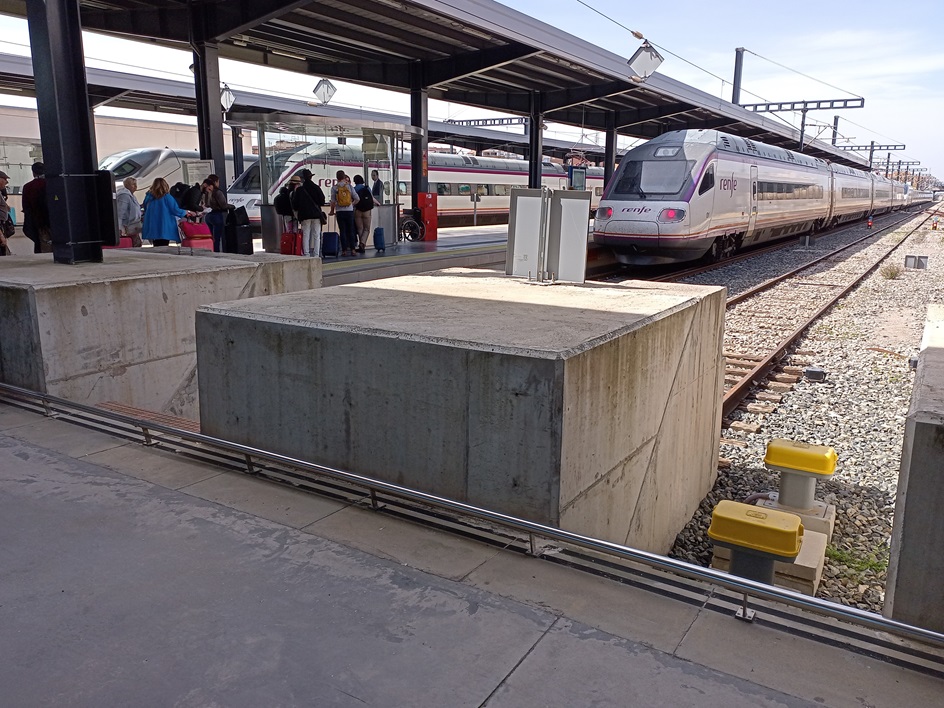 Eine Viertelstunde später fährt der Bus vor dem Bahnhofsgebäude von Huércal-Viator vor. Dort können die Fahrgäste über einen provisorischen Bahnsteig auf den Zug umsteigen. Ein Zustieg in Huércal-Viator, z. B. für die örtlichen Anwohner, ist offiziell übrigens nicht möglich. Die RENFE verkauft die Fahrt von Almería nach Granada nach wie vor als durchgehende Reisekette und in den Fahrplandaten ist der Halt bzw. Umstieg in Huércal-Viator nicht hinterlegt. Daher können keine Fahrkarten von und zu diesem Halt gebucht werden. Praktisch ist der provisorische Bahnsteig von außen jedoch frei zugänglich. Das Zugpersonal fragt daher kurz nach der Abfahrt explizit danach, ob noch Reisende dazu gekommen sind, die eine Fahrkarte (tariflich dann wohl ab Almería) benötigen.