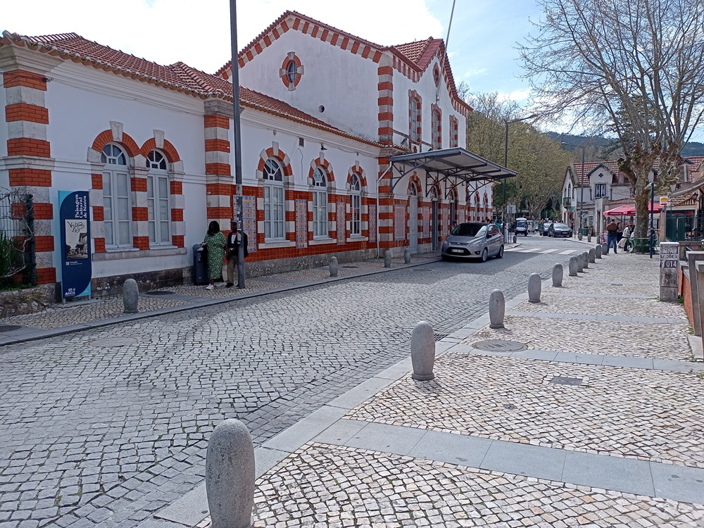 Mit dem nächsten Bus fahren wir weiter in die Stadt Sintra. Unterwegs folgt die Straße abschnittsweise der Strecke der Straßenbahn Sintra, die die Stadt mit dem Strand Praia das Maçãs verbindet.