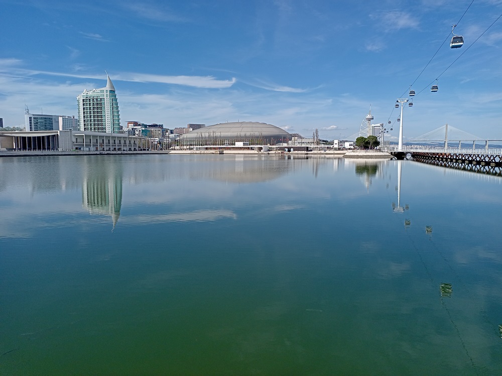 Von links: Bürogebäude, Konzerthaus, Hotelturm, Seilbahn, Fußgängersteg und Straßenbrücke über den Tejo.