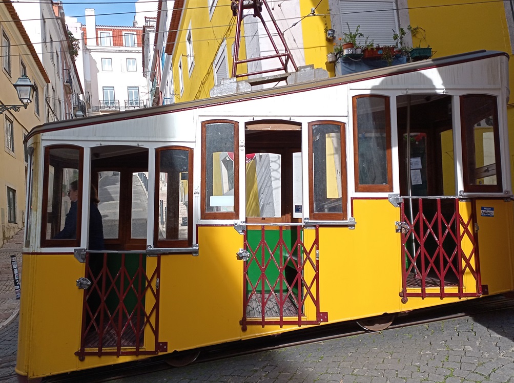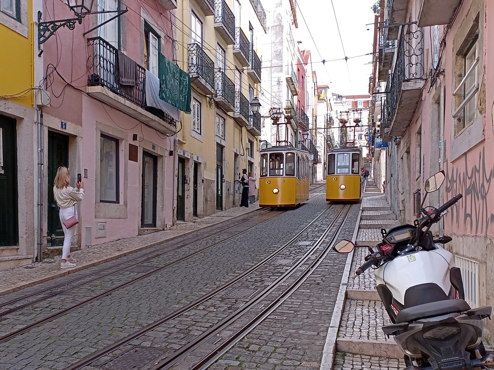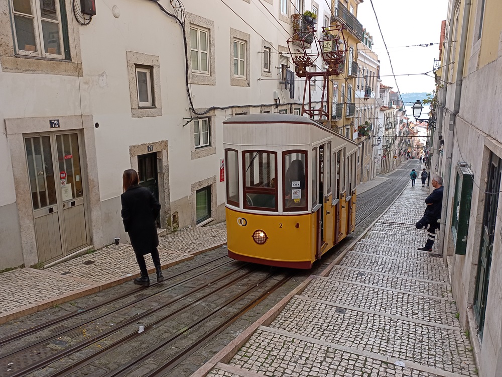 Die Linie 28 ist nicht nur wegen der historischen Fahrzeuge, sondern auch wegen der besonderen Streckenführung bekannt. Die Strecke verläuft, teils eingleisig, durch die engen Gassen der Alfama, der Altstadt von Lisboa. Dabei müssen die kleinen Triebwagen ohne Zahnstange Steigungen bis zu 14% überwinden. Das macht die Fahrt in dem historischen Fahrzeug mit Kurbelsteuerung insgesamt zu einem sehr interessanten Erlebnis. Gerade deshalb fahren wir an diesem Sonntag bereits gegen 8:30 eine Runde mit, da die Bahn zu dieser Zeit noch nicht zu voll ist. Später, wenn die Mehrheit der Touristen ihr Frühstück beendet hat, wird es in den Fahrzeugen dann sehr eng.