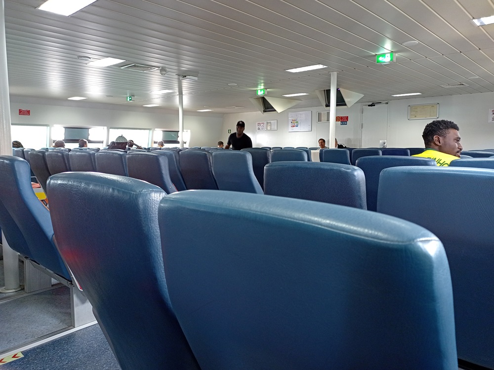 Das Fährterminal Terreiro do Paço liegt direkt am Fuße der Innenstadt. Dort fahren die Fähren auf die andere Seite des Tejo in die Nachbarstadt Barreiro ab. Mit Seefahrtsromantik hat der Fährbetrieb von Transtejo aber nichts zu tun. Die Tejo-Fähren sind Massenverkehrsmittel und auf die Beförderung von mehreren hundert Fahrgästen gleichzeitig ausgelegt. Im Terminal wird neben den nachfolgenden Abfahrten auch die bisherige Auslastung der nächsten Fähre angezeigt (gemessen an der Anzahl der bereits eingecheckten Fahrgäste). An diesem Sonntag hält sich die Auslastung aber in Grenzen und erreicht gerade einmal rund 20%, zumal die Tejo-Fähren am Sonntagnachmittag ab 16:00 von einem Stundentakt zum Halbstundentakt verdichtet werden.