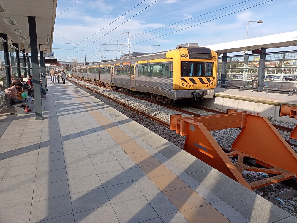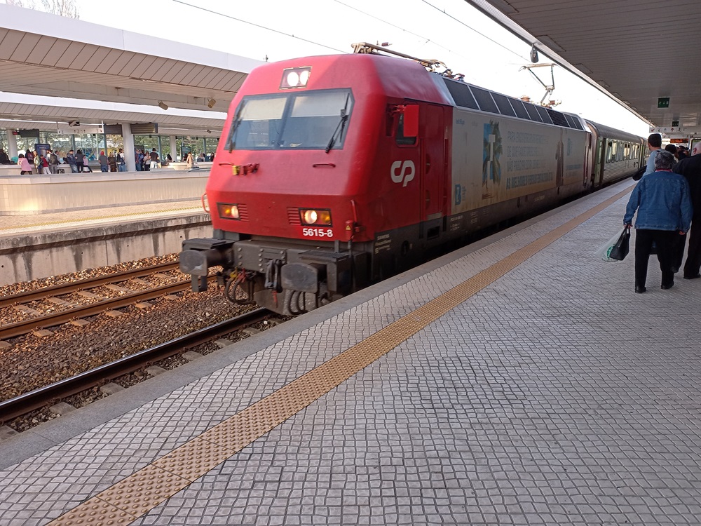 Mit dem IC fahren wir eine Station bis zum Bahnhof Pragal, der sich noch südlich des Tejo befindet. Der Grund, warum wir im IC und nicht in einem Nahverkehrszug von fertagus gelandet sind, ist übrigens banal: Ich hatte für die Fahrt von Barreiro nach Pragal die Fahrplanauskunft der CP konsultiert und diese Verbindung mit dem IC vorgeschlagen bekommen. In den anderen Stunden, in denen kein IC in einer passenden Zeitlage verkehrt, wurde keine Verbindung angezeigt. Das war zwar verwunderlich, aber ich hatte das nicht weiter hinterfragt. Erst bei der Ankunft in Lisboa am Vortag habe ich dann festgestellt, dass die Nahverkehrszüge über die Ponte 25 de Abril von einer privaten Bahngesellschaft (fertagus) betrieben werden. Damit war dann auch klar, warum die CP sie nicht als Fahrtmöglichkeiten ausgibt.