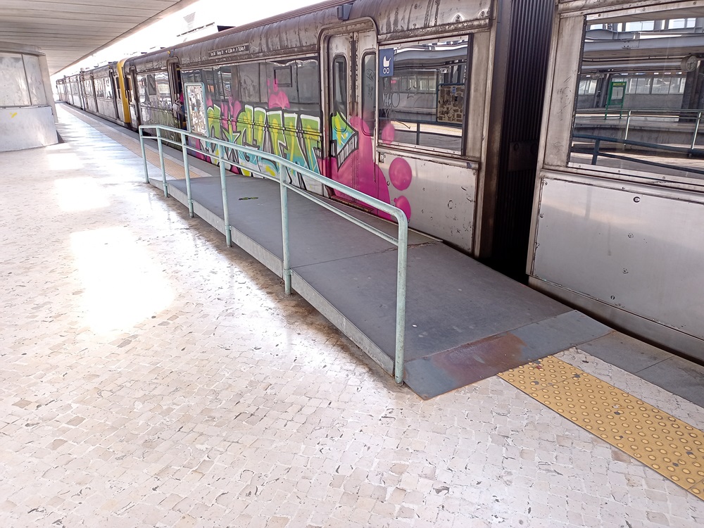 Santa Apolónia war und ist für viele Züge nach wie vor Ausgangspunkt zur Fahrt in den Norden des Landes. Der Kopfbahnhof wird allerdings nicht mehr von allen Fernverkehrszügen, die aus Richtung Norden kommen bzw. dorthin fahren, bedient, da heute über die Ponte 25 de Abril auch Durchbindungen in den Süden des Landes möglich sind. Ein Beispiel dafür ist unser Alfa Pendular am Vortag, der zwar von Lisboa nach Porto fährt, aber von Faro durchgebunden ist und daher nicht am Bahnhof Santa Apolónia vorbei kommt. Von Santa Apolónia aus müssen wir nur noch eine Station mit der blauen Linie der Metro fahren, bevor wir das Fährterminal erreichen.