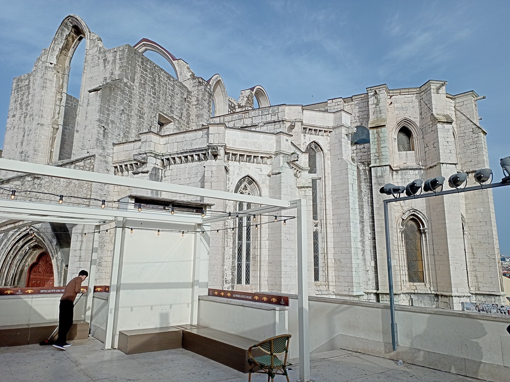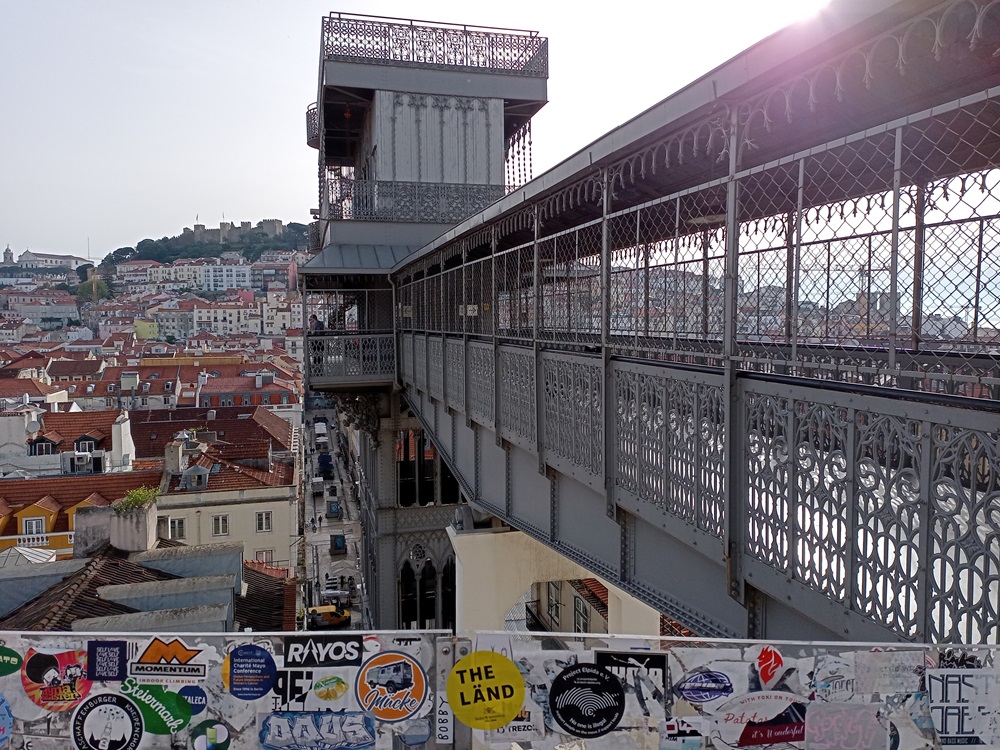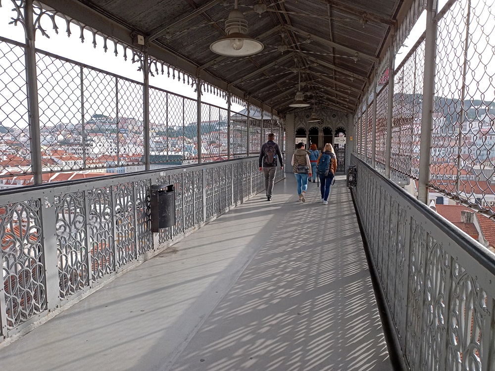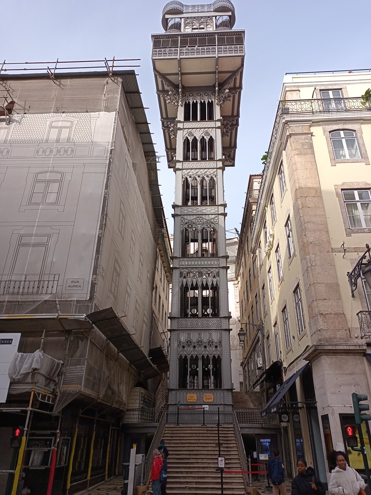 Neben den drei Standseilbahnen betreibt die Carris auch einen „gewöhnlichen“ Standaufzug, den Elevador Santa Justa, der den Praça do Rossio mit dem höher gelegenen Stadtteil Chiado verbindet. Da wir mit dem Ascensor de Glória bereits den Berg hinauf gefahren sind, erreichen wir den Aufzug „von oben“ durch das Stadtviertel Chiado.