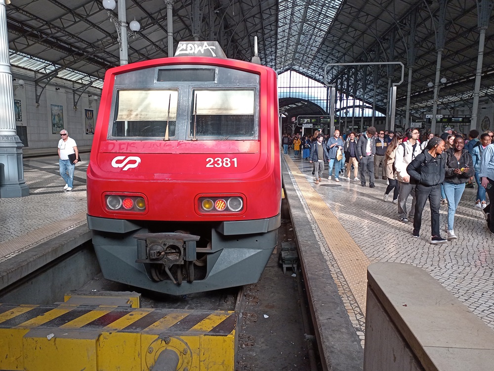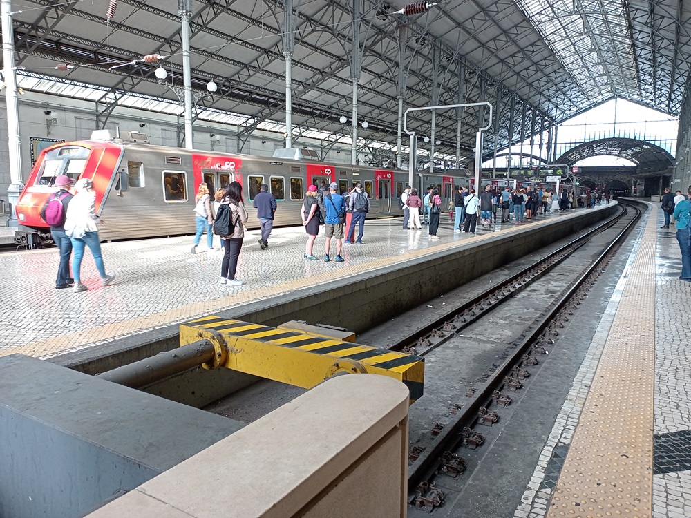 Nach der Ankunft des Zuges aus der Vorleistung steigen wir hinten ein und suchen uns einen der vielen freien Plätze aus. Ich wundere mich noch, dass so wenige Fahrgäste in den hinteren Zugteil einsteigen, mache mir aber erst einmal nichts daraus. Kurz darauf geht im Zug das Licht aus, sodass wir beschließen, doch noch einmal auszusteigen und nachzusehen. Dabei stellen wir fest, dass der hintere Zugteil gerade abgehängt und abgestellt wird. Eilig hasten wir daher zum gut gefüllten vorderen Zugteil, der kurz darauf den Bahnhof in Richtung Sintra verlässt.