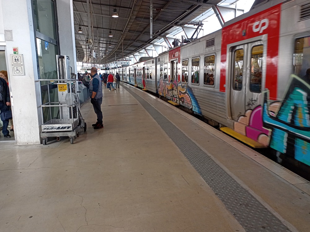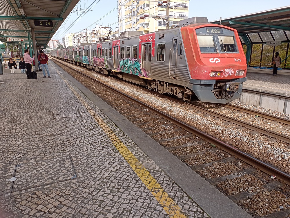 Während der Wartezeit fährt am Gleis gegenüber ein Zug nach Rossio ein.