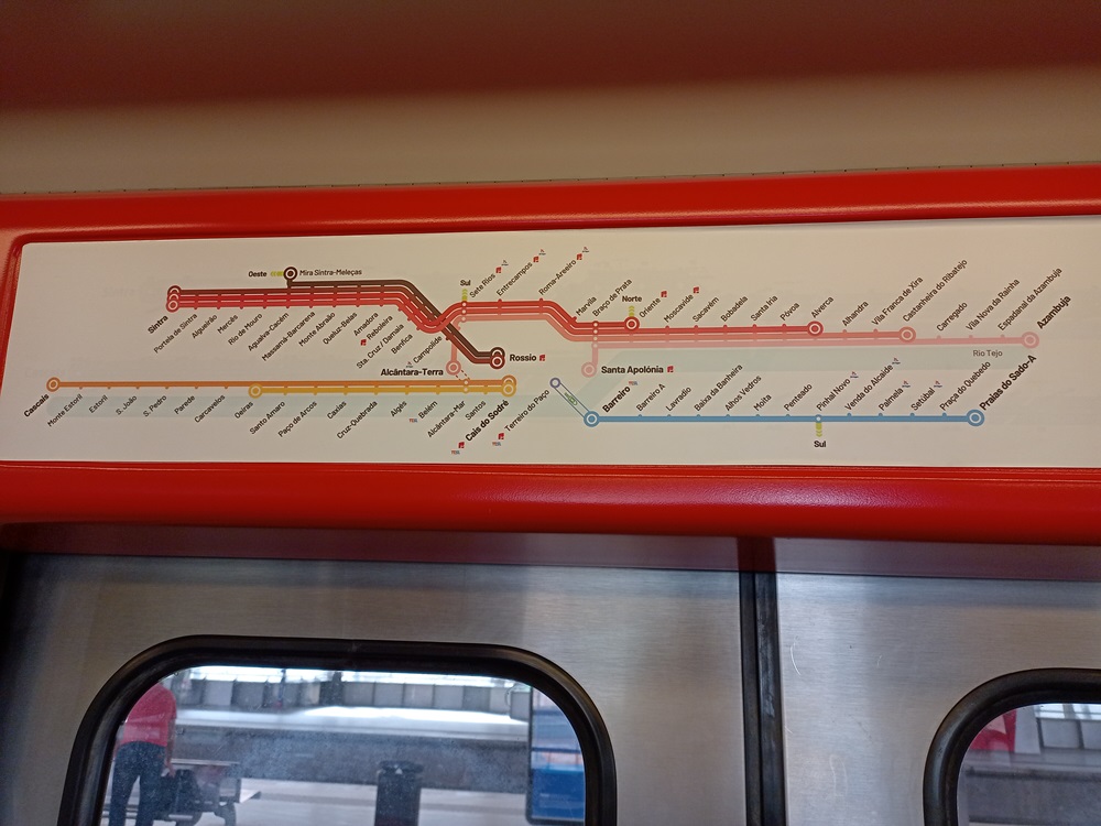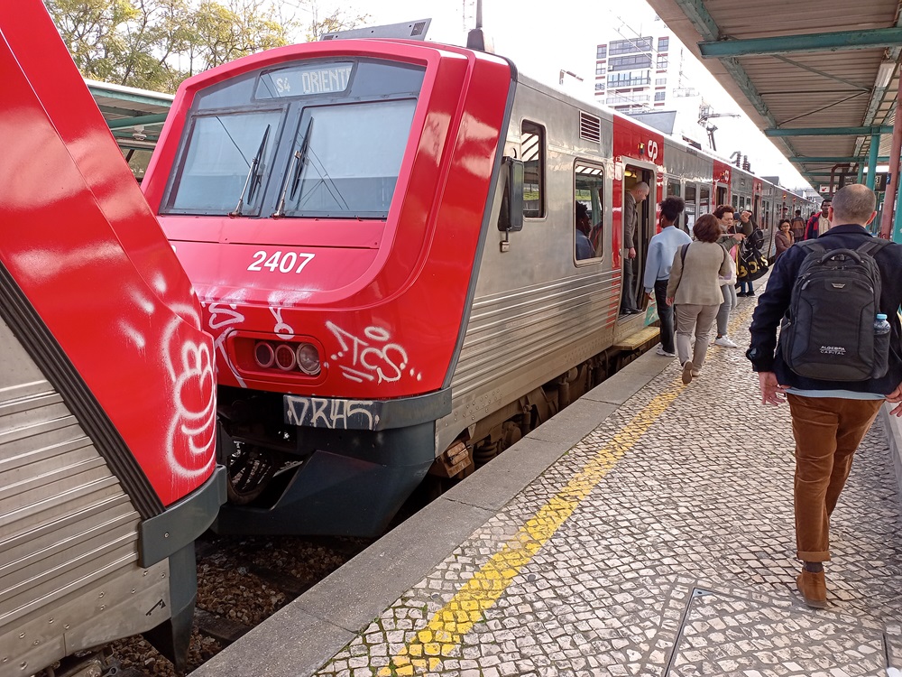 Der Bahnhof Rossio befindet sich direkt in der Innenstadt. Deshalb schließt an die Bahnhofsausfahrt ein langer Tunnel an, der zum Bahnhof Campolide führt. Dort laufen von Süden kommend die Strecken von der Ponte 25 de Abril und von Rossio zusammen. In nördlicher Richtung bilden die beiden nun vereinigten Strecken von Süden mit den Strecken nach Lisboa Oriente und nach Sintra ein Gleisdreieck. Theoretisch könnten in Lisboa Oriente aus Richtung Norden ankommende Züge somit auch weiter nach Rossio statt nach Santa Apolónia fahren. Diese Relation wird aber derzeit nicht bedient. Wir fahren daher mit einem Urbano in Richtung Sintra am Gleisdreieck stadtauswärts bis zum ersten Halt Benfica. Dort steigen wir um auf einen Zug der Urbanos-Linie nach Lisboa Oriente, die wir gestern bereits genutzt haben.
