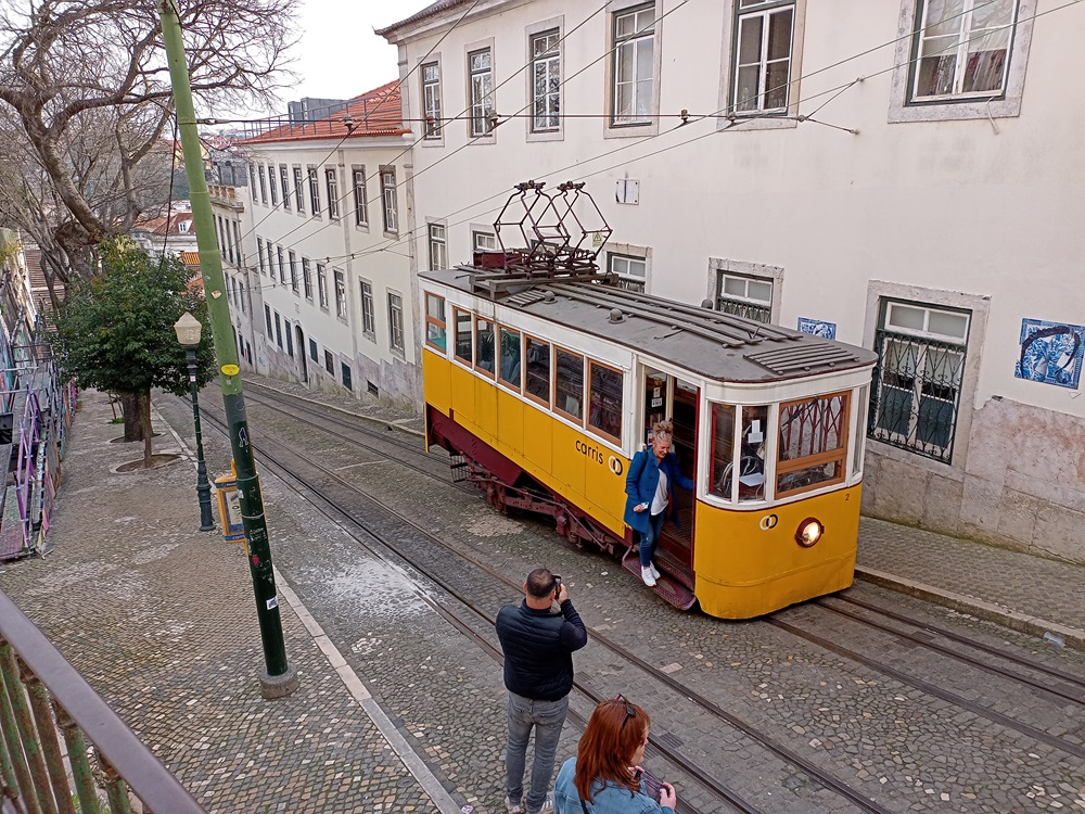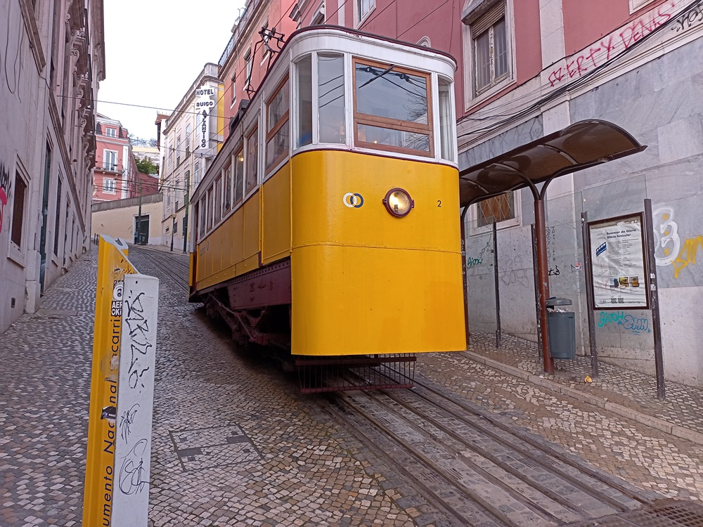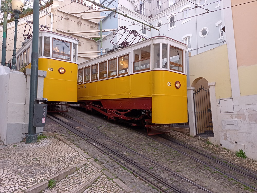 Nachdem wir gestern bereits den Ascensor de Bica gesehen haben, möchten wir uns heute noch die anderen beiden Standseilbahnen in Lisboa anschauen. Daher gehen wir aus der Alfama hinunter zum Praça Martim Moniz, an dem die Linie 28 endet, und von dort über einen Treppenweg hoch auf den Hügel, der die Bergstation des Ascensor de Lavra beheimatet. Der Ascensor de Lavra ist die älteste der drei Standseilbahnen. In der Nähe der Bergstation befindet sich die medizinische Fakultät der neuen Universität von Lisboa, sodass die bergwärts fahrenden Bahnen teils gut besetzt sind, während die Wagen auf der Talfahrt zumeist leer fahren.