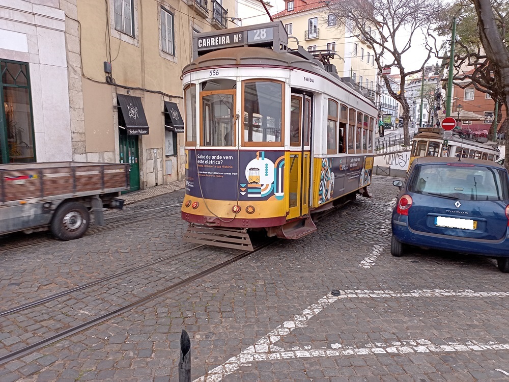 Der letzte Reisetag unserer Halb-Umrundung der iberischen Halbinsel bricht an und wir nehmen uns an diesem Tag noch etwas mehr Zeit für die portugiesische Hauptstadt Lisboa, bevor wir am Nachmittag den Rückflug nach Frankfurt antreten. Mit dem Sonnenaufgang stehen wir auf und fahren mit einem Stadtbus der Linie 781, die abschnittsweise als Expressbus mit weniger Zwischenhalten verkehrt, durch den morgendlichen Berufsverkehr zur Haltestelle Sul e Sueste nahe des Fährterminals Terreiro do Paço. Von dort aus ist das Altstadtviertel Alfama, in dem u. a. die Straßenbahnlinie Linie 28 verkehrt, nach einem leichten Aufstieg zu Fuß erreichbar.