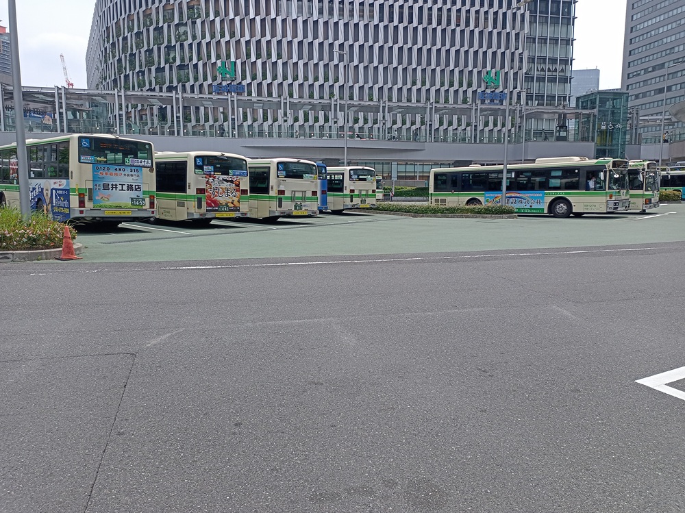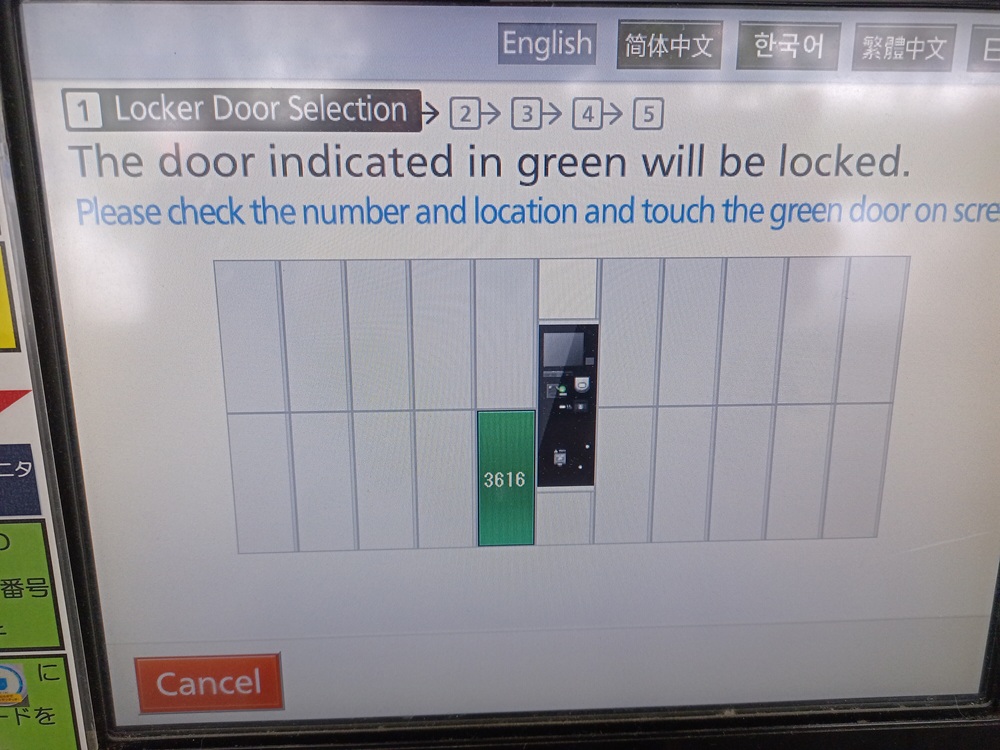 Am Bahnhof Ōsaka angekommen gilt es nun, das Gepäck loszuwerden, denn der Check-In im Hotel ist erst ab 15:00 möglich. Dafür stehen auf dem weitläufigen Bahnhofsgelände an mehreren Stellen Schließfächer bereit. An den ersten beiden Standorten, die ich nahe des Central Gate ansteuere, habe ich Pech und alle großen Fächer sind belegt. Dann erreiche ich den 3. Standort am South Exit vor dem Busbahnhof.