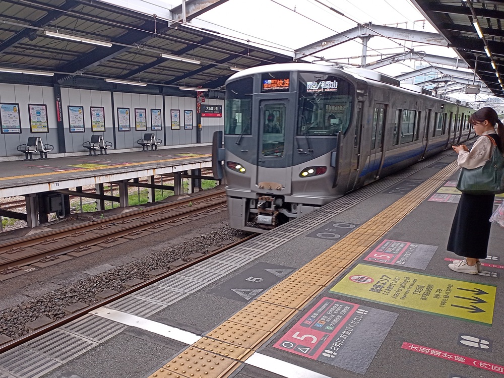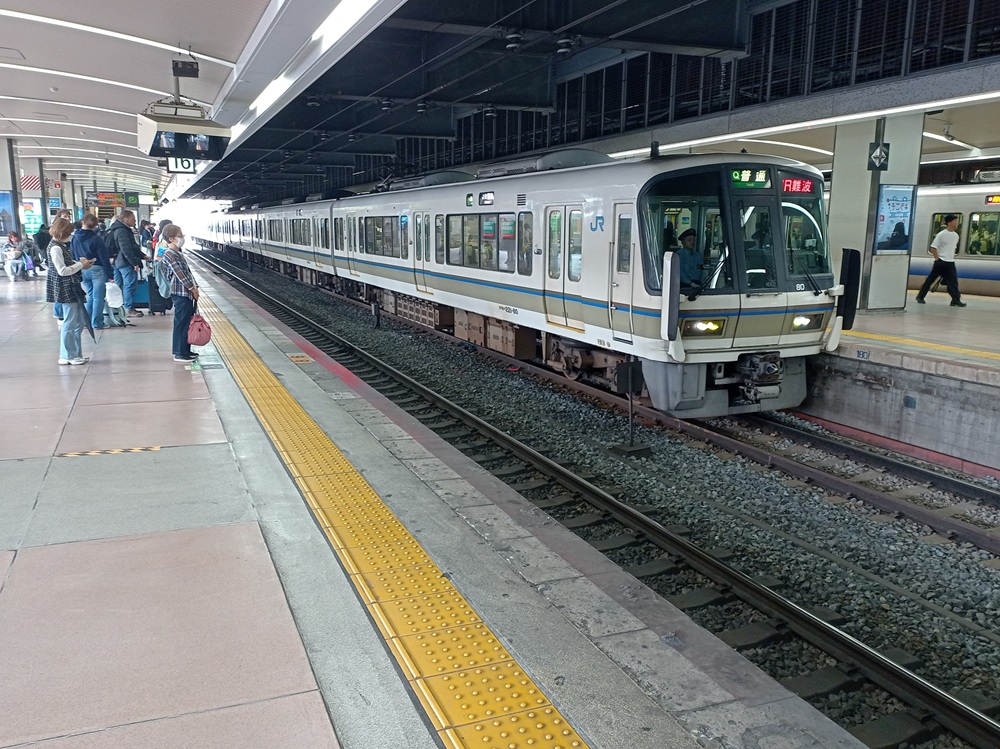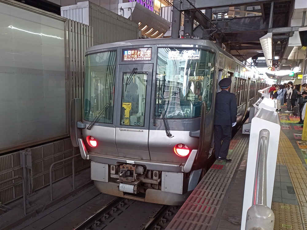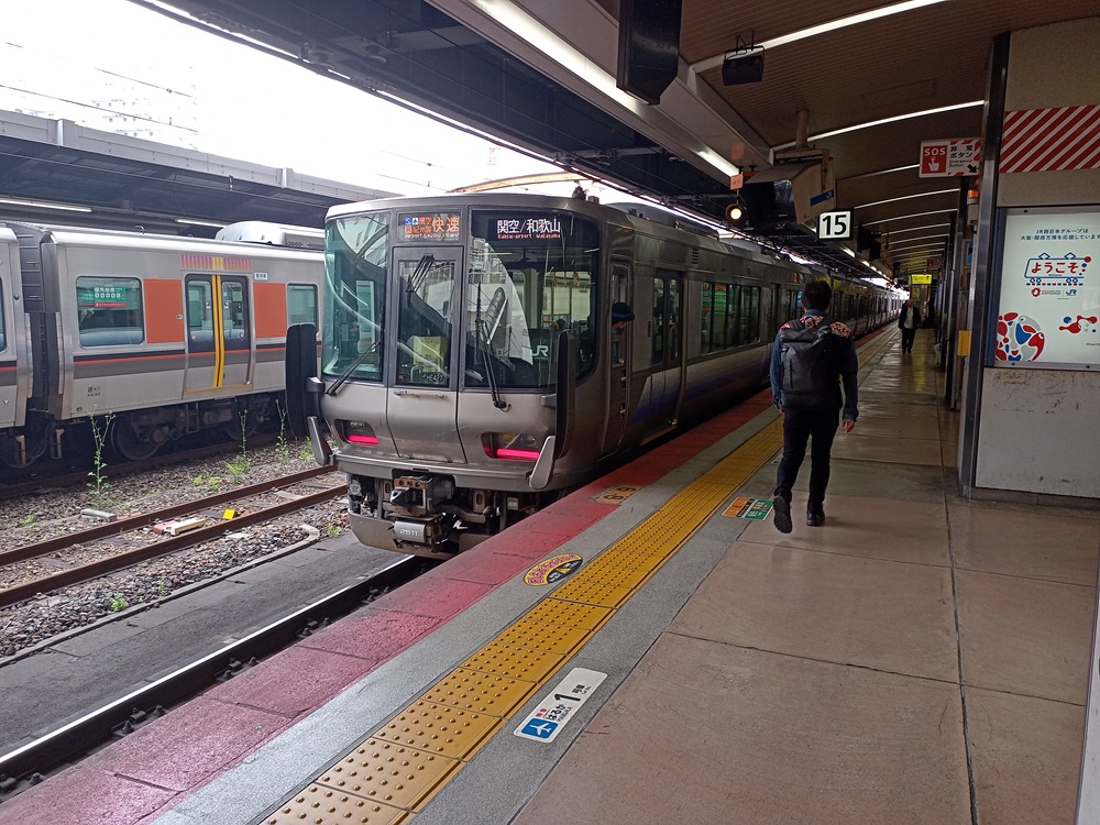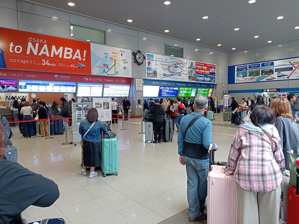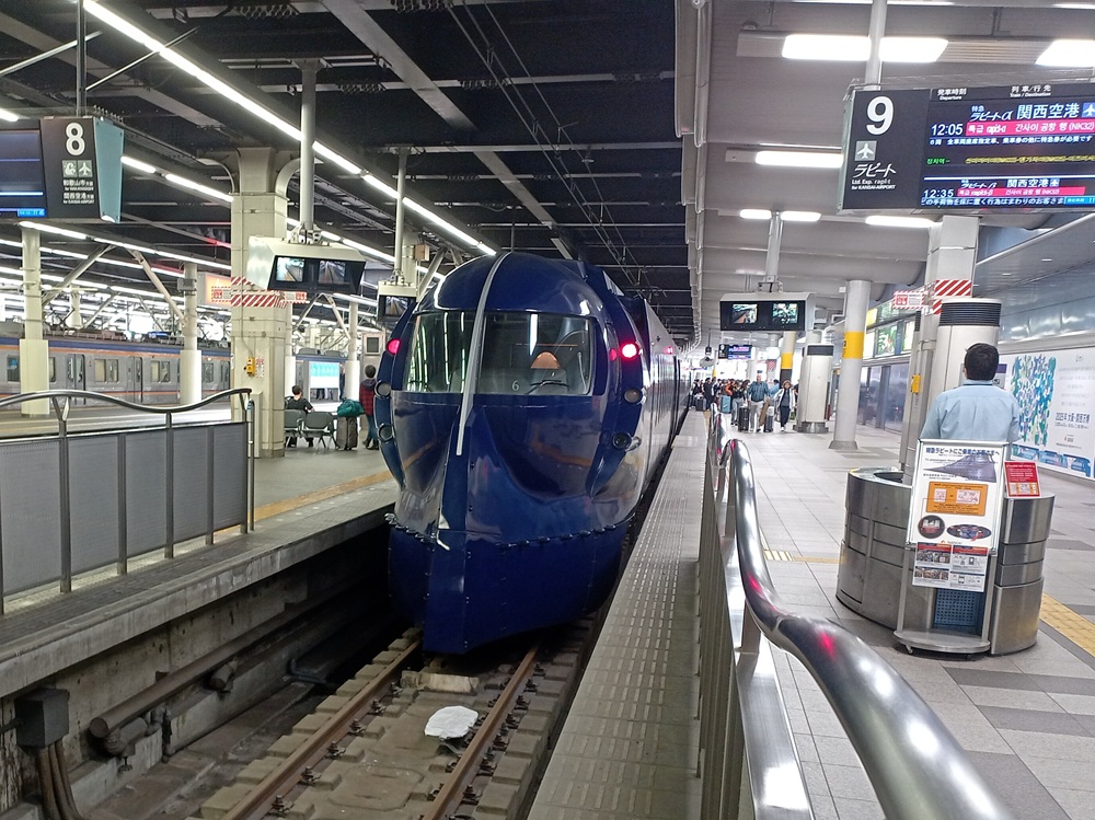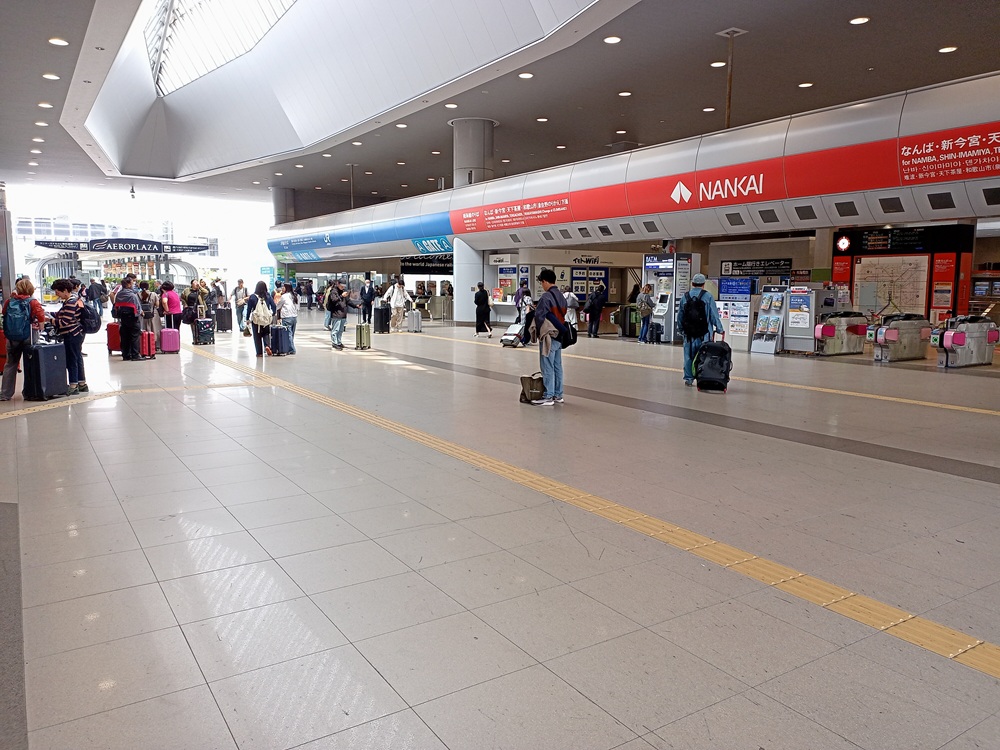 Kansai Airport ist der internationale Flughafen der Region um Ōsaka. Der Flughafen liegt aufgrund seines Platzbedarfs auf einer künstlich angelegten vorgelagerten Insel in der Seto-Inlandsee vor der Küste der Stadt Izumisano, rund 35 Kilometer südlich des Stadtzentrums von Ōsaka. Die erste Bahnfahrt in Japan wird demnach vom Flughafen in die Innenstadt von Ōsaka führen. Vorher kaufe ich allerdings bei einem der Mobilfunkanbieter im Terminal eine Daten-SIM für meinen Aufenthalt. Für die nächsten 16 Tage erhalte ich einen Unlimited-Tarif (mit „fair use“-Klausel, die man aber nur mit absurd hohem Datenverbrauch ausreizen kann) für 7.000 Yen (43,75 €). Nicht günstig, dafür stimmen Service und Leistung. Die Mitarbeiterin, die fließend Englisch spricht, setzt die Karte in mein Gerät ein und geht mit mir so lange die Konfiguration durch, bis es schließlich funktioniert. Die Netzabdeckung ist gut und außer an den „üblichen“ Stellen (in engen Bergtälern und in der U-Bahn z. B.) hatte ich immer besseres Internet als zu Hause bei meinem deutschen Anbieter. Nun kann die (Bahn-)Reise aber losgehen und wir begeben uns zum Flughafen-Bahnhof.