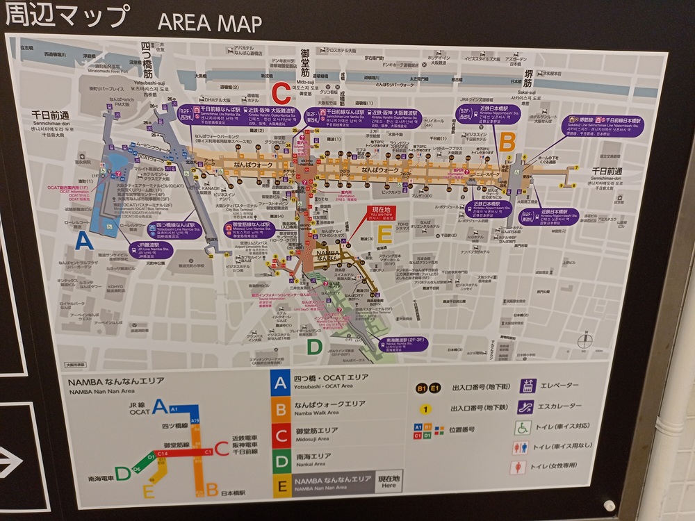 Nachteil der Nankai Railway ist in unserem Fall, dass sich deren Endbahnhof in Ōsaka noch einige Kilometer vom Hotel entfernt befindet. Vom Hauptbahnhof der JR West, der einfach nur Ōsaka genannt wird, wären es dagegen nur einige Minuten zu Fuß. Ab Namba müssen wir daher das fehlende Stück zum JR-Bahnhof mit der Metro zurücklegen. Die Midosuji Line benötigt von Namba aus 10 Minuten zur Station Umeda, die unterirdisch mit dem JR-Bahnhof verknüpft ist. Vor der Reise habe ich noch überlegt, ob ich mein Gepäck auf die Fahrt in die Stadt mitnehmen soll oder nicht. Denn: U-Bahnen in Japan können voll werden und da sind Reisende mit viel Gepäck nicht gerne gesehen. Kurierdienste können für vergleichsweise kleines Geld Abhilfe schaffen. Allerdings geht die Gepäckmitnahme in der U-Bahn um 12:00 durchaus und die Auslastung ist auch nicht viel höher als in deutschen Verkehrsmitteln zu dieser Zeit. Ich steige in den letzten Wagen ein und finde für meinen Koffer ausreichend Platz zwischen der letzten Tür und der angrenzenden Sitzbank. Das kleine Gepäck kann in der Gepäckablage verstaut werden. So brauche ich im Zug auch nicht mehr Platz als eine etwas stämmigere Person (von denen es in Japan aber nicht viele gibt).
