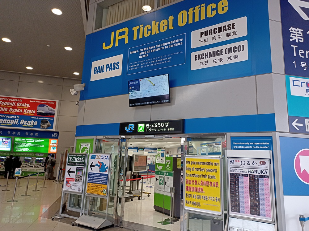 Die meisten längeren Fahrten werden wir mit den JR-Bahnen absolvieren, sodass ich dafür einen Japan Rail Pass als „japanisches Interrail“ reserviert habe. Den Pass kann man einen Monat vor Reisebeginn online auf der dafür eingerichteten offiziellen Webseite (japanrailpass.net, erkennbar daran, dass die Seite durch die JR Japan Railways Group betrieben wird) kaufen. Im Anschluss können ebenfalls mit einem Monat Buchungsvorlauf auf dieser Webseite Sitzplatzreservierungen getätigt werden, die alle kostenlos und im Pass inkludiert sind. Einige Fahrten auf beliebten Strecken bzw. zu reisestarken Tageszeiten hatte ich so bereits vorab reserviert. Die Ausgabe der Passfahrkarte erfordert allerdings ein persönliches Vorsprechen am Fahrkartenschalter. Das Reisezentrum der JR West am Flughafen-Bahnhof ist an diesem Montagmorgen schwach frequentiert, sodass ich direkt bedient werde. Ich zeige dem Mitarbeiter, der einige Worte Englisch spricht, einen Zettel mit meiner Bestellnummer und er prüft daraufhin meinen Reisepass. Um einen Japan Rail Pass ausgestellt zu bekommen, benötigt man nämlich den Einreisestatus „Temporary Visitor“, der allerdings mit dem Einreisegrund „Tourism“ auf dem Einreiseformular automatisch vergeben wird. Kurz darauf händigt er mir meine Passfahrkarte aus – ein kleines grünes Ticket, das durch die automatischen Bahnsteigsperren gelesen werden kann. Er bietet mir zudem an, auch die 7 vorab getätigten Sitzplatzreservierungen auszudrucken – mit dem Hinweis, dass das doch „einige“ seien. Wenn der wüsste was ich noch vor habe… 😉 Wie auch immer: Die Fahrten mit den JR-Bahnen ab Tag 3 sind nun abgedeckt. Für die übrigen Fahrten besorgen wir uns an einem benachbarten Fahrkartenautomaten eine Bezahlkarte. In Japan gibt es ein landesweites System an Bezahlkarten („IC-Cards“) für den öffentlichen Verkehr, die nach dem Check-In-Check-Out-Prinzip genutzt werden können. Die Karten werden dabei ähnlich der Oyster Card in London oder der navegante-Karte in Lisboa als nicht-personalisierte Chipkarte regional vertrieben, sind allerdings vergleichbar zur niederländischen OV-Chipkaart national einsetzbar, also auch über die Grenzen des ausgebenden Unternehmens hinaus. Die im Raum Ōsaka erhältliche IC-Card der JR West heißt ICOCA. Mit dieser Karte werde ich in den nächsten Tagen mit wenigen Ausnahmen alle ÖPNV-Fahrten (die nicht schon im Japan Rail Pass enthalten sind) bezahlen können. Ein kleiner Nachteil: Die Bezahlkarte kann nur mit Bargeld aufgeladen werden. Das Aufladen ist an fast jedem Fahrkartenautomaten möglich, aber eben nicht mit Kreditkarte. Andererseits kann die aufgeladene Bezahlkarte auch zum Bezahlen an den landestypischen Getränkeautomaten oder in vielen Lebensmittelgeschäften genutzt werden.