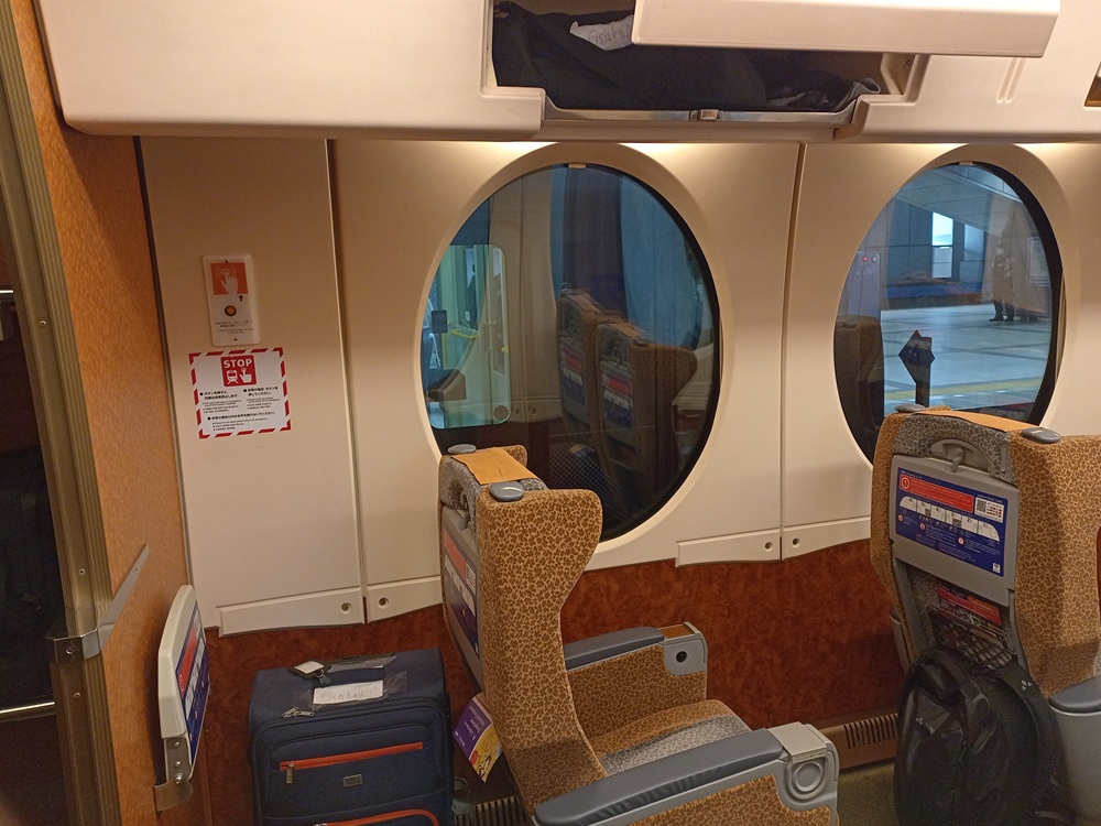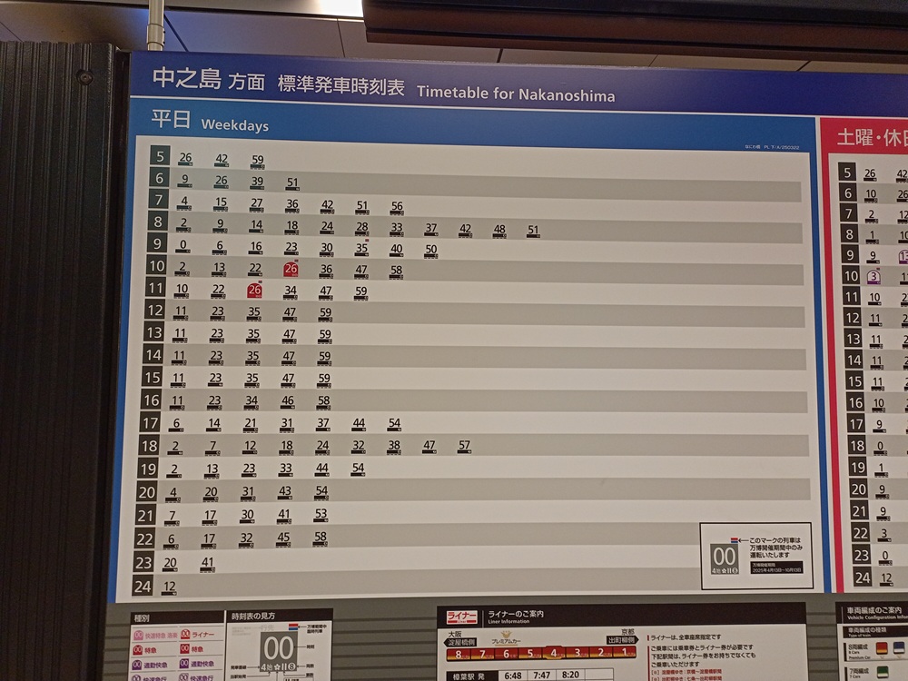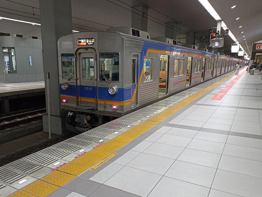 Da wir den Flughafenexpress der JR West am letzten Reisetag mit dem Japan Rail Pass ohne Mehrkosten nutzen können, entscheiden wir uns für den privaten Wettbewerber. Der Konkurrenzkampf zeigt sich deutlich bei den Fahrpreisen. Die 43 Kilometer lange Strecke zum Endbahnhof Namba der Nankai Railway in Ōsaka ist eine Stunde vor Abfahrt in einem Schnellzug der Gattung „Limited Express“ in der 1. Wagenklasse (bei Nankai als „Super Seat“ bezeichnet) zum Festpreis von 1.700 Yen (10,65 €) zu haben. Sitzplatzreservierung mit platzgenauer Auswahl aus einer Wagenskizze am Automaten mit englischsprachigem Menü inklusive (und es sind noch viele Plätze frei). Zum Vergleich: Der Münchener Verkehrsverbund verlangt für die einzelne Fahrt vom Hauptbahnhof zum Flughafen auf einer ähnlich langen Strecke derzeit 14,30 € für die Fahrt in der 2. Klasse der S-Bahn.