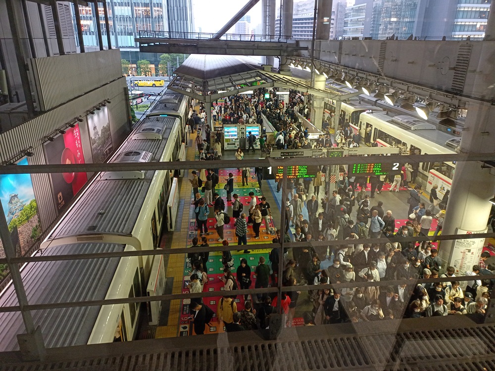 Bei Ankunft am Bahnhof Ōsaka wird noch ein weiteres Detail der Betriebsführung japanischer Eisenbahnen deutlich: Der Zweimannbetrieb! In Japan besteht die Arbeitsteilung zwischen Triebfahrzeugführer und Zugführer fort. Der Tf fährt den Zug von Bahnsteig zu Bahnsteig und der Zf bedient zentral die Türen, überwacht den Fahrgastwechsel und erteilt den Abfahrtauftrag. Dadurch können japanische EVU im dichten Verkehr auf vielbefahrenen Strecken wertvolle Sekunden bei der Abfertigung des Zuges sparen.