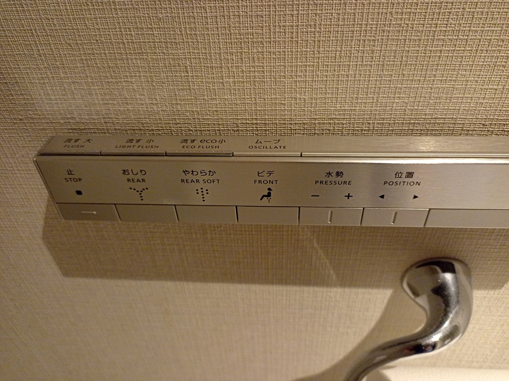 Tatsächlich waren die japanischen Heimtoiletten der größte Kulturschock. Die Toilette ist über ein Kabel an eine Wandsteckdose angeschlossen. Beim Hinsetzen kommt zur Begrüßung erst einmal ein kleiner Luftzug von unten. Anschließend beginnt die Sitzheizung (!) warm zu werden. Das Spülen wird ebenfalls automatisch aktiviert, sobald man aufsteht. Darüber hinaus gibt es noch viele interessante Knöpfe auf einer Steuerungsleiste (Bild 1-55), die ich mich zwar nicht zu nutzen traue, die aber jemandem, der damit vertraut ist, möglicherweise eine komfortablere Nutzung ermöglichen. Für mich hätte es dieses High-Tech-Örtchen nicht gebraucht, aber trotzdem eine lustige Erfahrung.