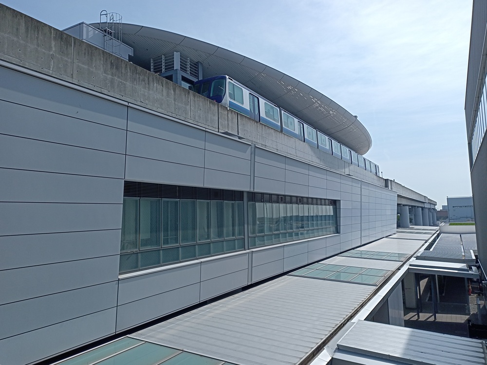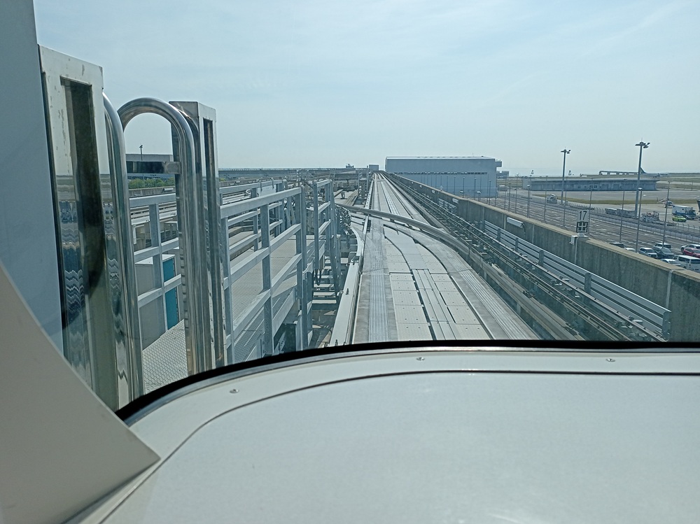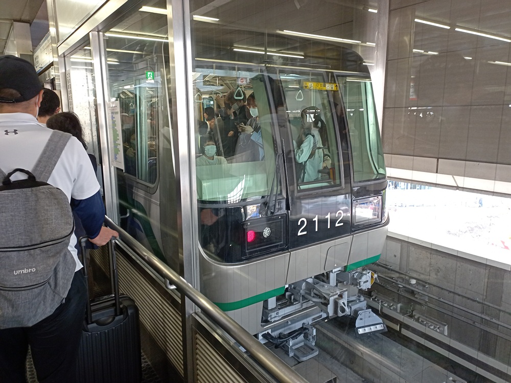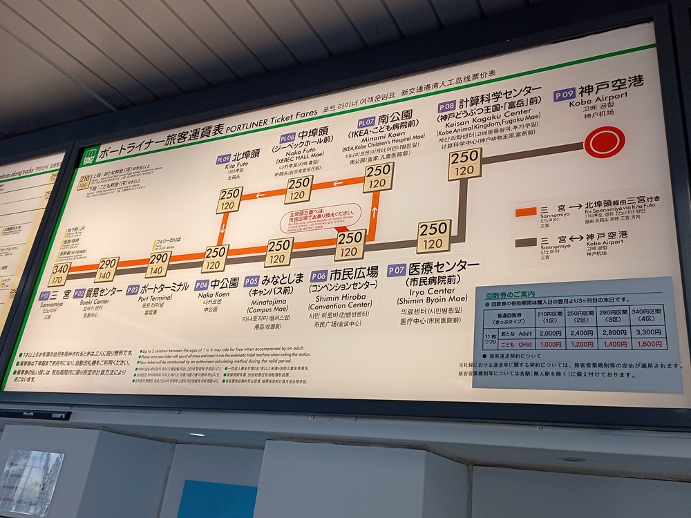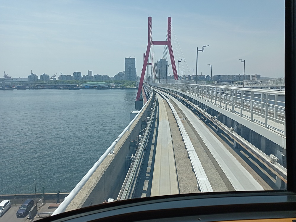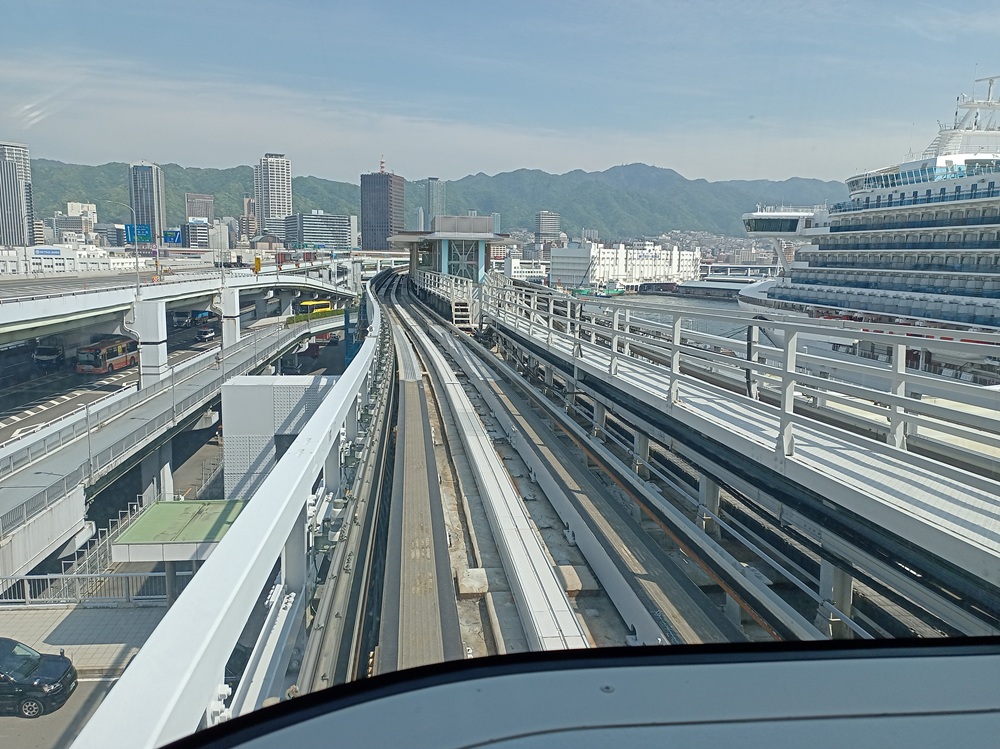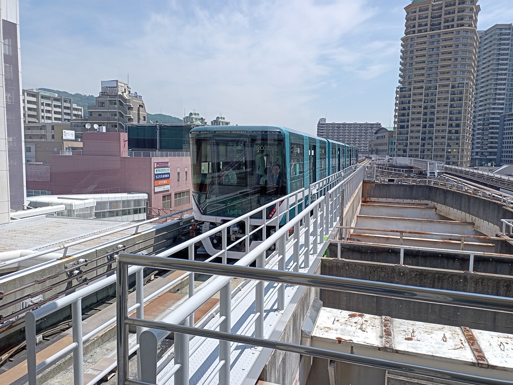 Wir fahren mit dem Port Liner zunächst zur Endstelle am Flughafen Kōbe und reihen uns dafür am Bahnsteig in die Warteschlange ein. Die Züge sind zur HVZ so voll, dass wir bei der ersten Abfahrt noch zurück bleiben, dafür aber nach wenigen Minuten durch den Folgetakt aufgenommen werden. Ordner am Bahnsteig „lenken“ die Warteschlange und zeigen beim Zustieg an, wann der Wagen „voll“ ist. Die meisten Fahrgäste sind Studenten und steigen bereits an der dritten Station auf der künstlichen Insel nahe einer großen Universität wieder aus. Im Anschluss fährt der Zug recht leer seinem Endpunkt entgegen.