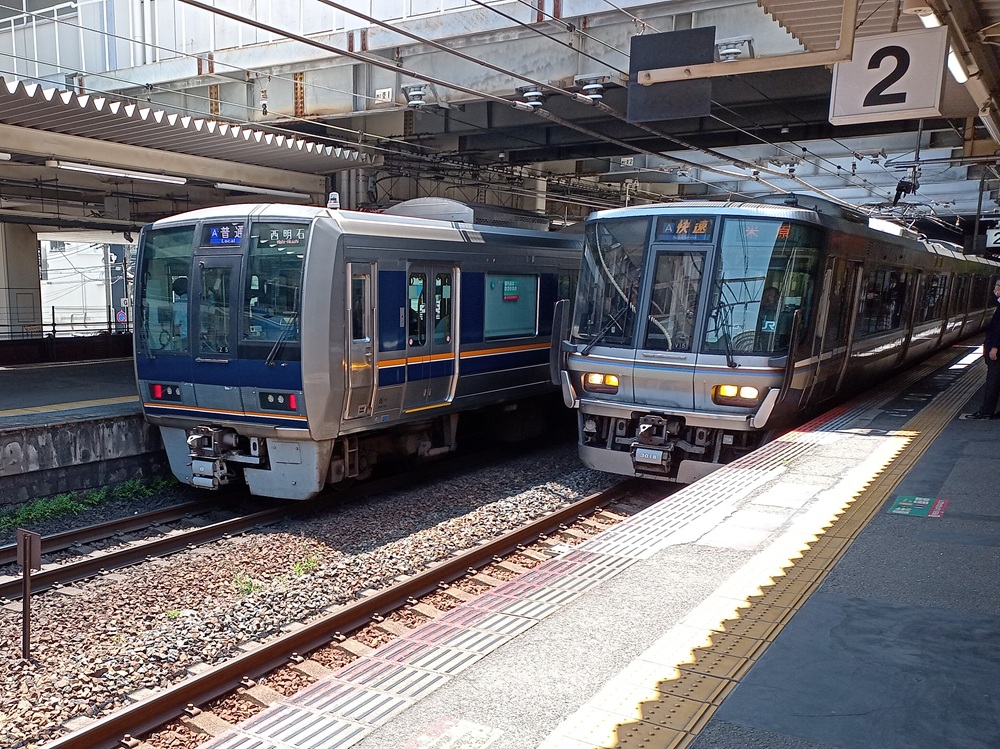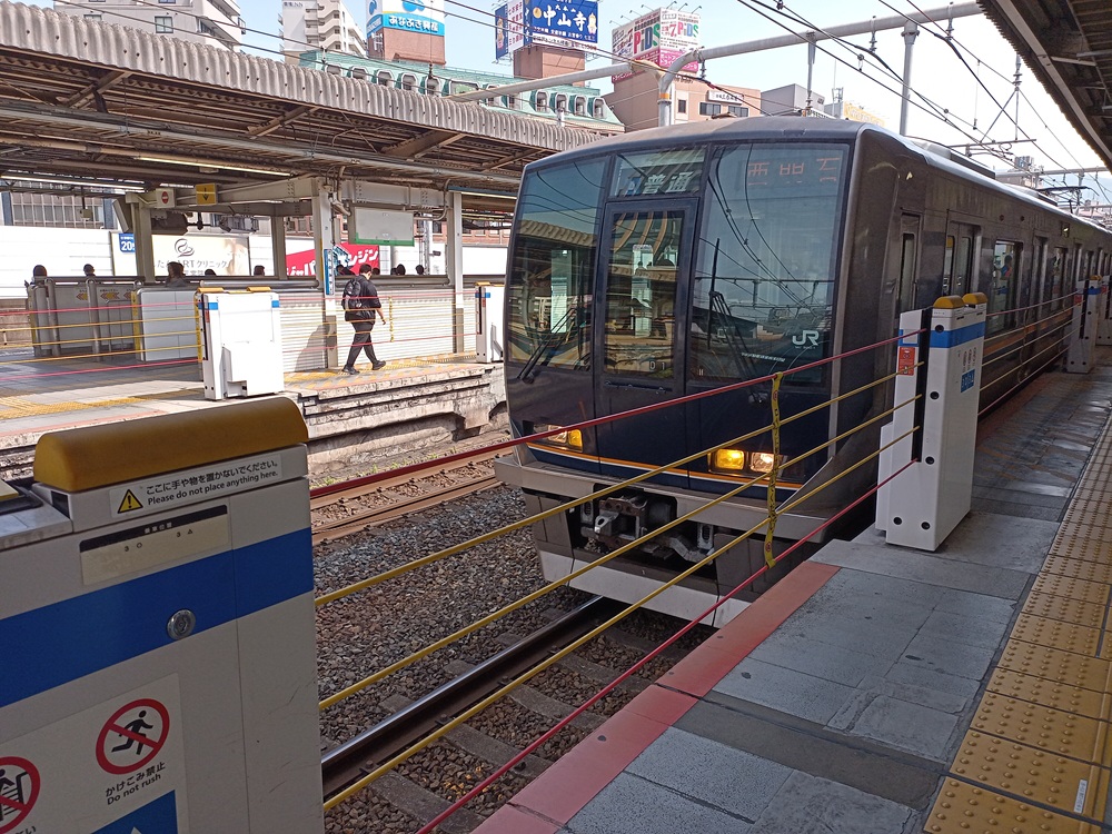 Von Sumiyoshi aus fahren wir zurück nach Ōsaka. In diese Richtung verkehren in einem 15-Minuten-Intervall jeweils zwei Locals und ein Rapid. Den letzten Rapid haben wir gerade verpasst. Dennoch ist es für uns schneller, die beiden nachfolgenden Locals fahren zu lassen und auf den nächsten Rapid zu warten. Der Rapid überholt die vorausfahrenden Locals dann jeweils in Ashiya und Amagasaki, sodass Fahrgäste aus den Zwischenhalten dort auf den schnelleren Zug umsteigen können.