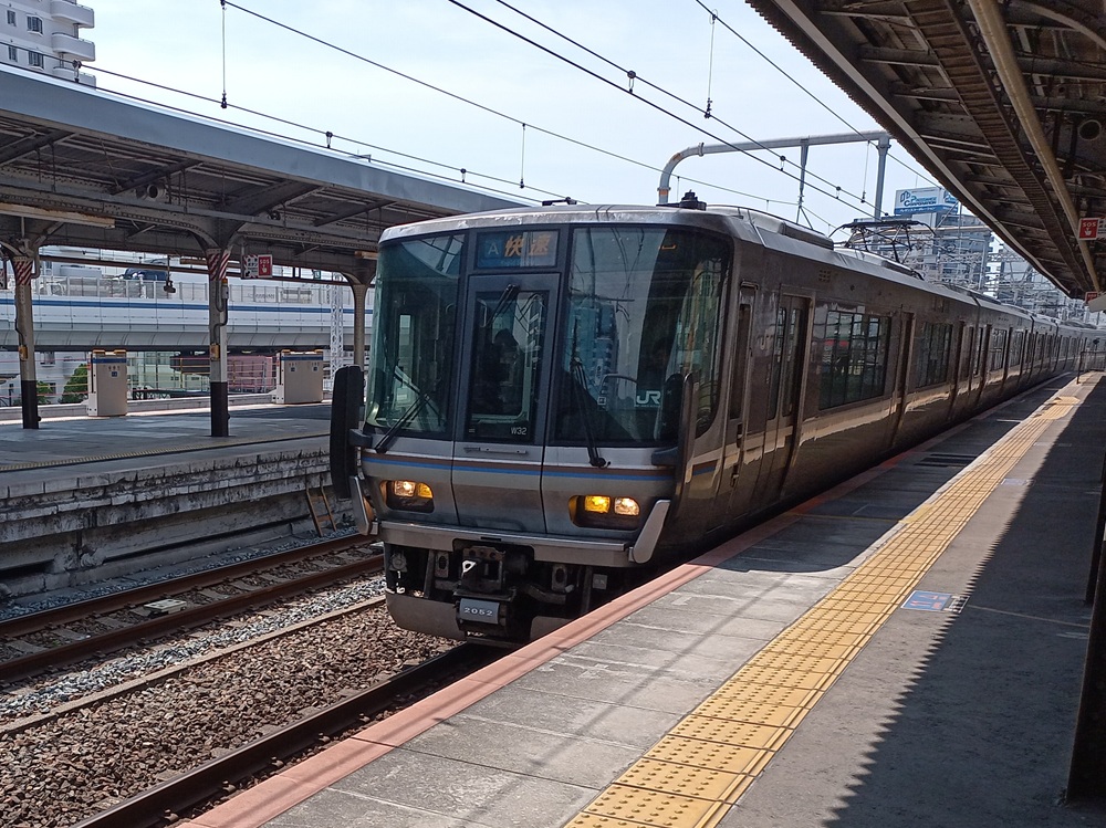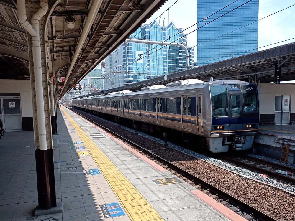 Der Super Hakuto 1 startet an diesem Morgen pünktlich um 7:38 in Ōsaka und soll den 31 Kilometer entfernten Bahnhof San’nomiya planmäßig bereits um 7:56 erreichen. 18 Minuten für 31 Kilometer entspricht einer Durchschnittsgeschwindigkeit von über 100 km/h – bei einer fahrzeug- und streckenseitigen Höchstgeschwindigkeit von 130 km/h sowie im dichten Berufsverkehr einer vielbefahrenen japanischen Hauptbahn bin ich da anfangs noch skeptisch. Tatsächlich verlangt der Tf dem Dieseltriebwagen aber ordentlich Leistung ab und wir heizen gleichmäßig schnell durch die urbanen Vororte Ōsakas. Auf der viergleisigen Tōkaidō Main Line, die in diesem Abschnitt auch Kōbe Line genannt wird, stehen schnellen Zügen die äußeren Gleise zur Verfügung. Dort verkehren tagsüber neben den Limited Express auch Special Rapid (die schnellsten Züge im Nahverkehr auf dieser Strecke) im 15-Minuten-Takt sowie Güterzüge in unregelmäßigen Abständen. Wie, trotz aller Zweifel, eigentlich nicht anders erwartet, kommen wir pünktlich um 7:56 in San’nomiya zum Halten.